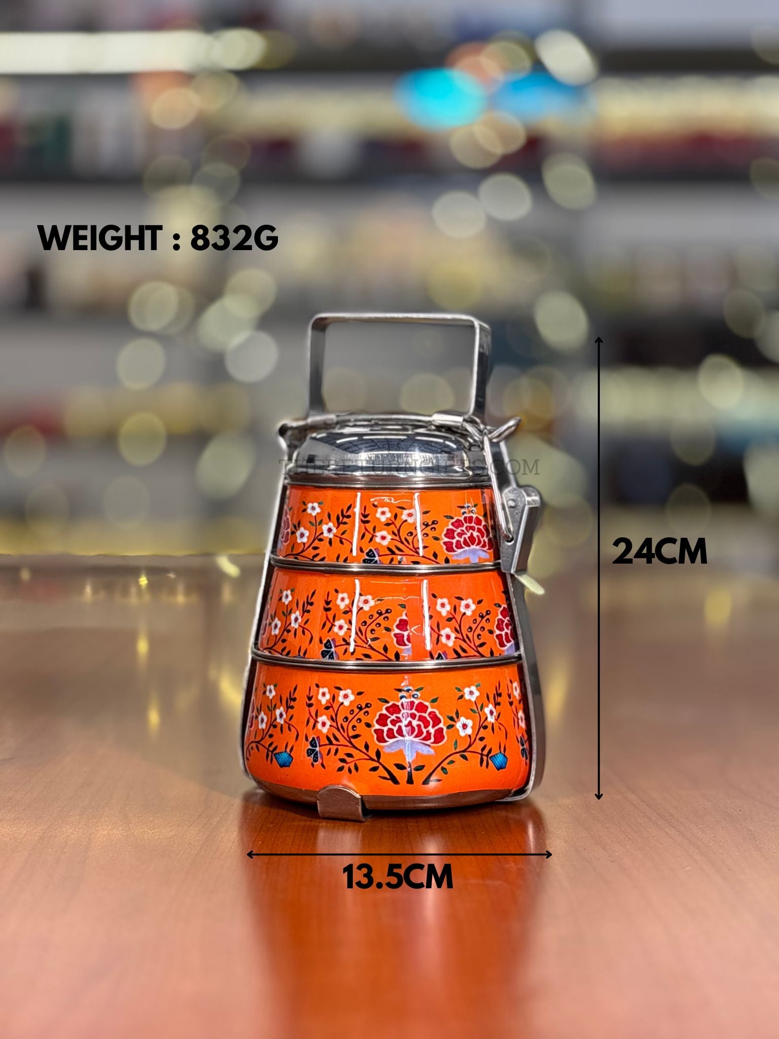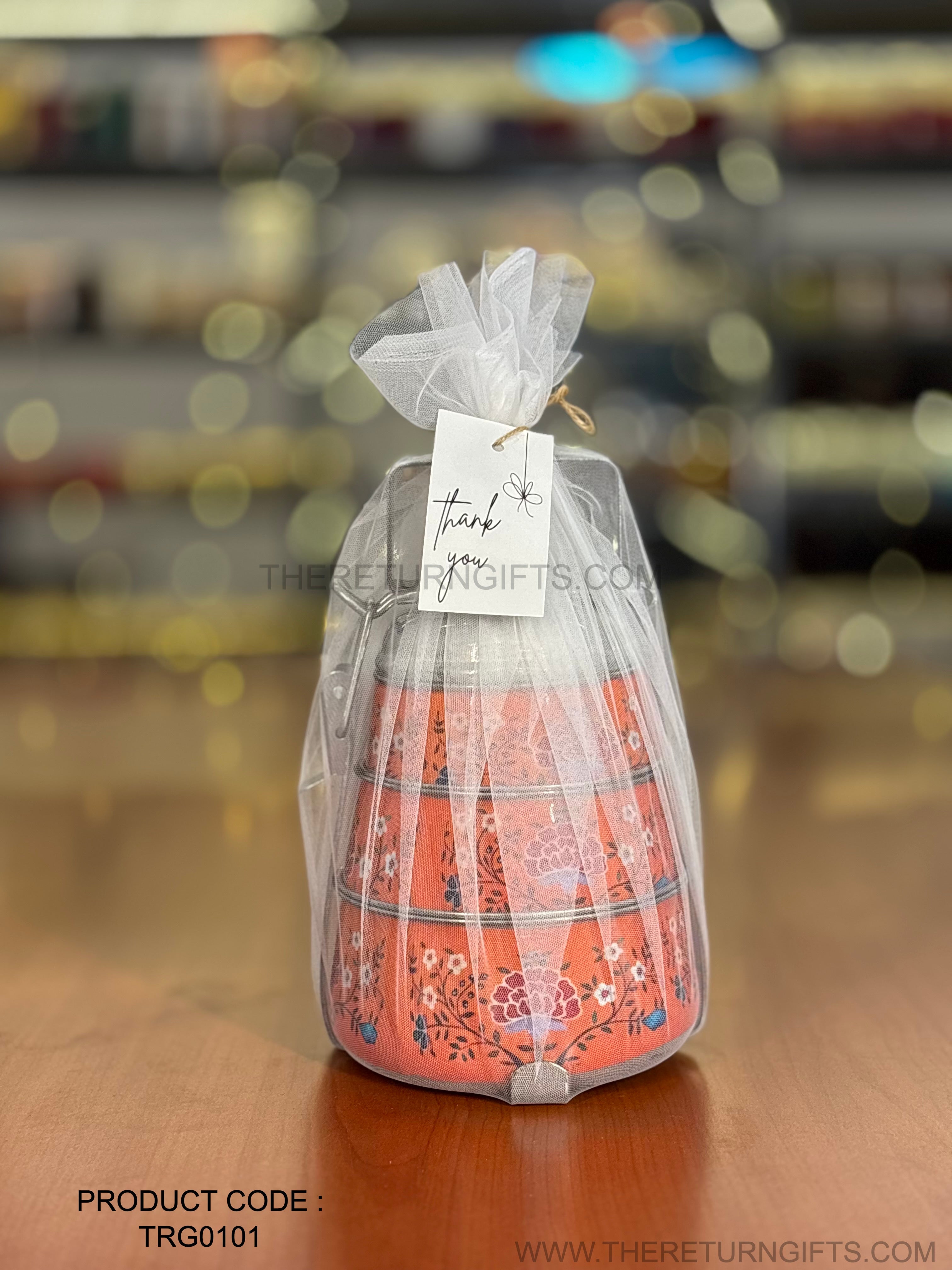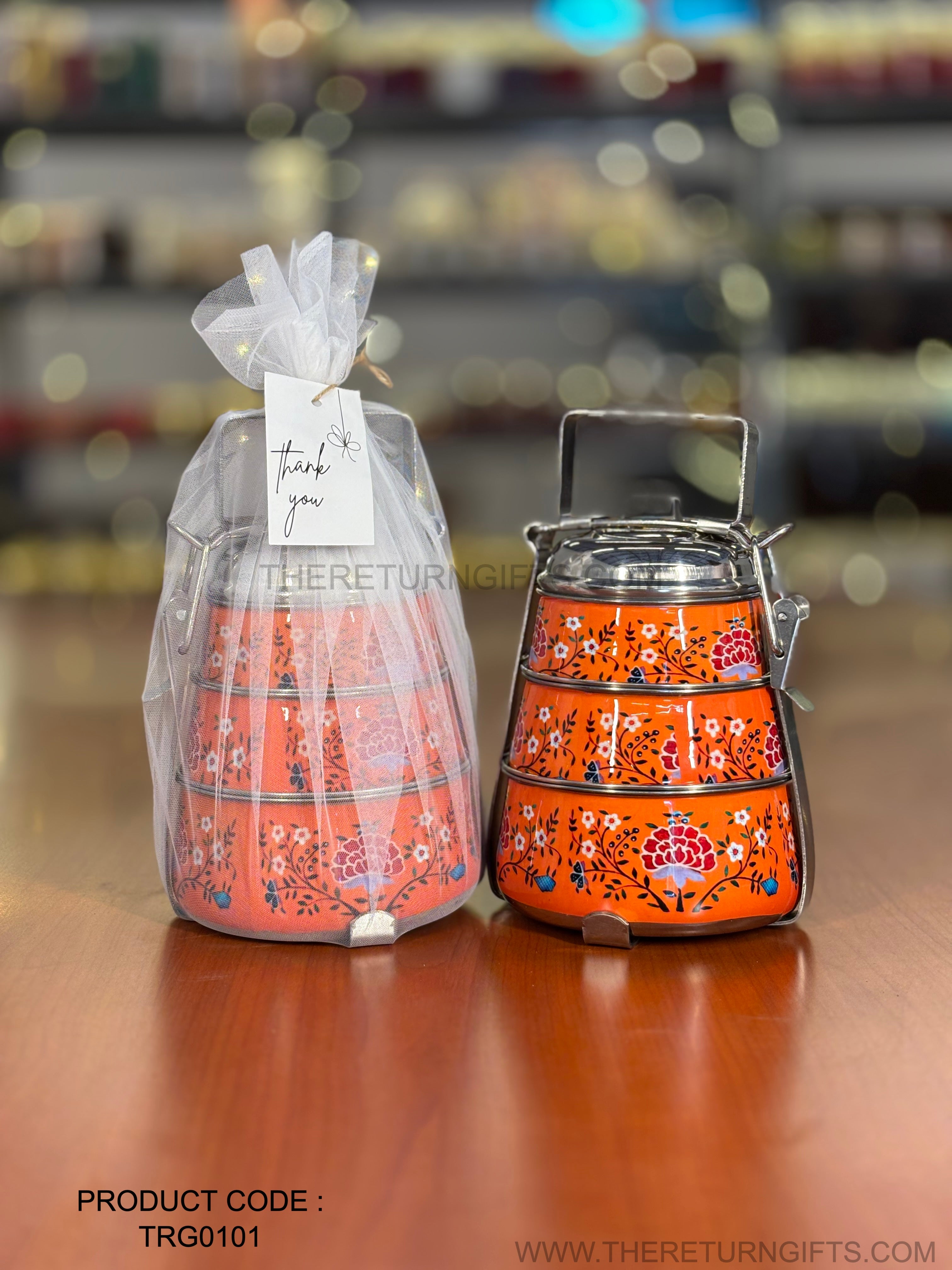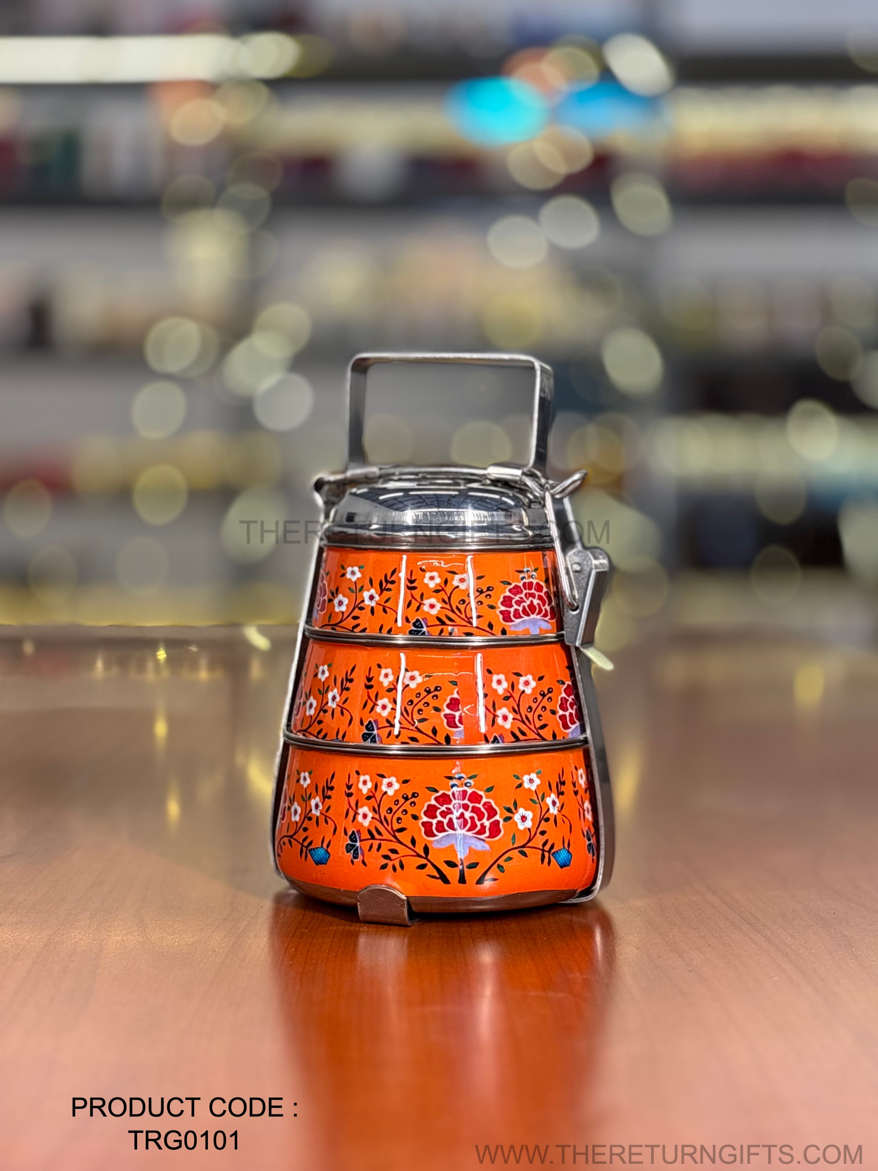 3‑Tier Orange Floral Printed Stainless Steel Tiffin Carrier | TRG0101 | Hand‑Painted 3 Layer Steel Lunch Box Under ₹1000 | Wedding & Housewarming Return Gift