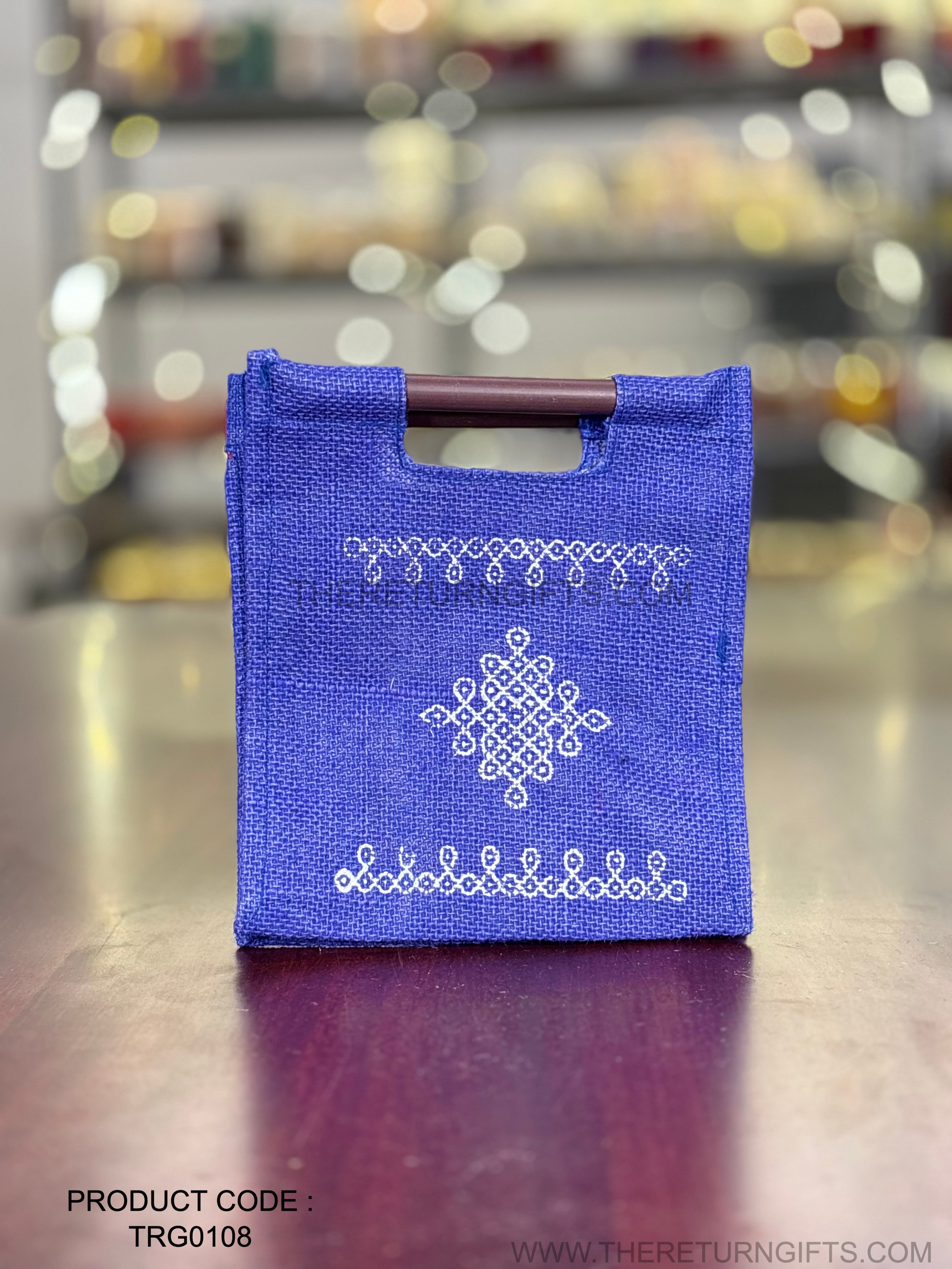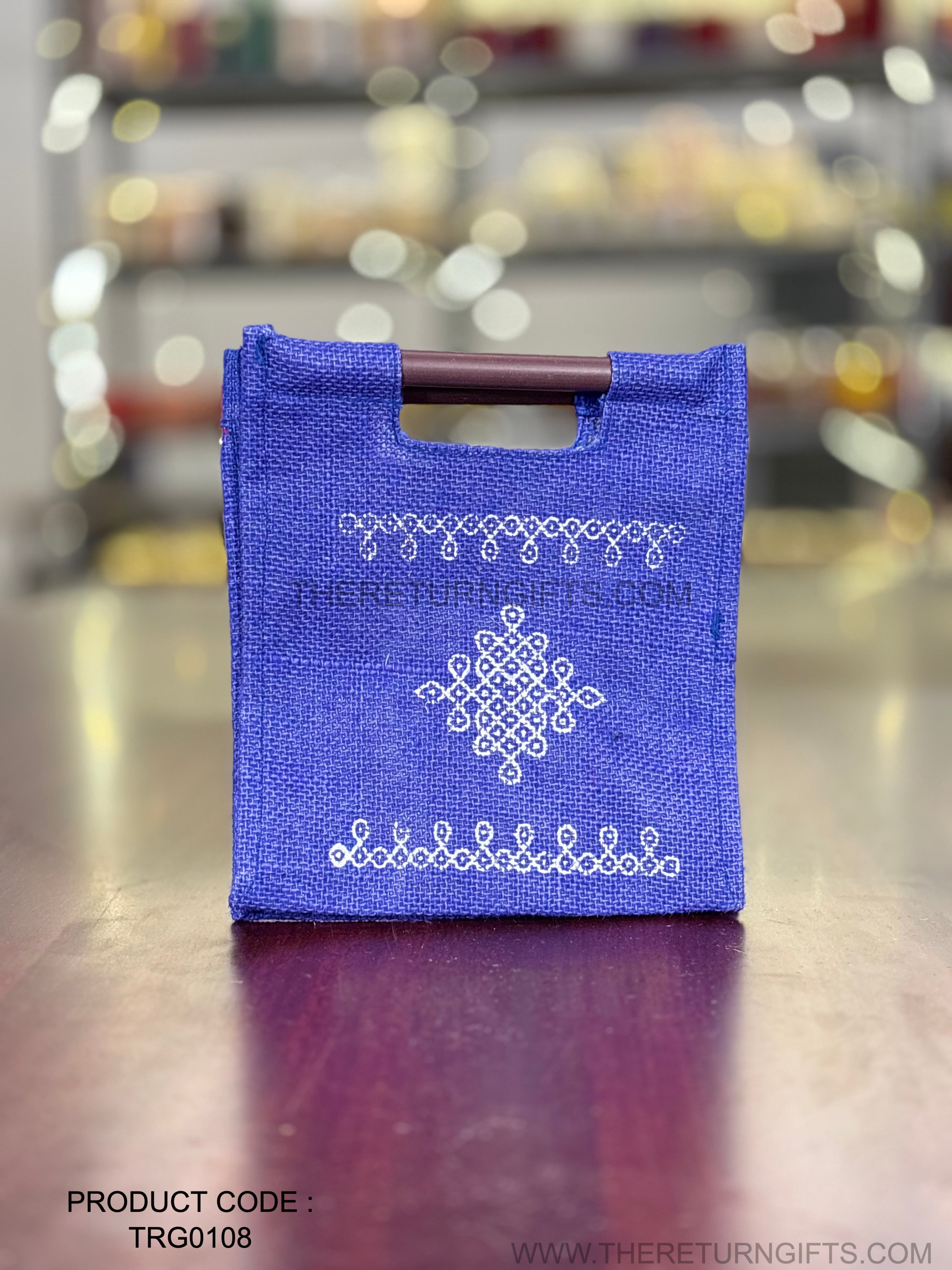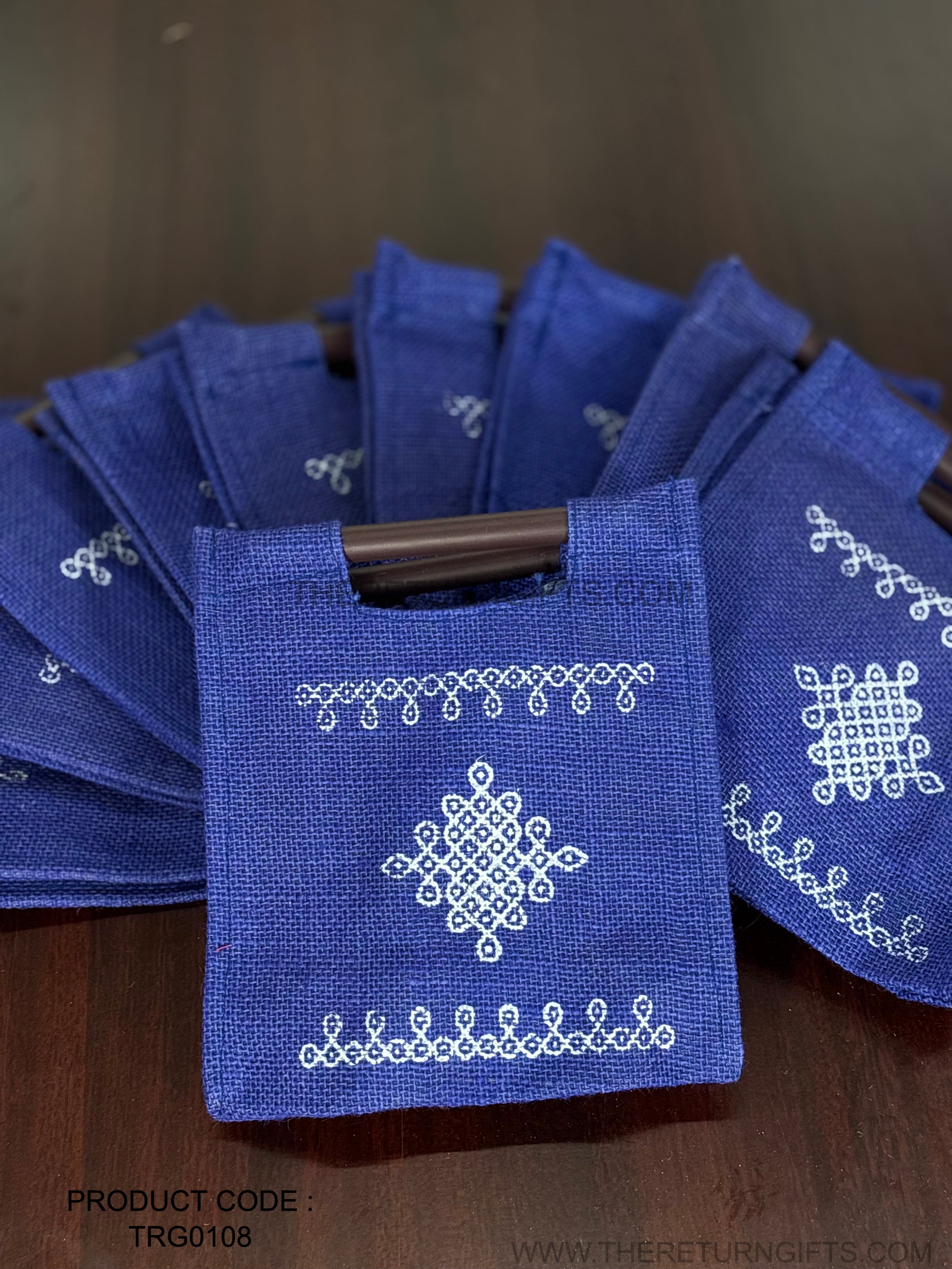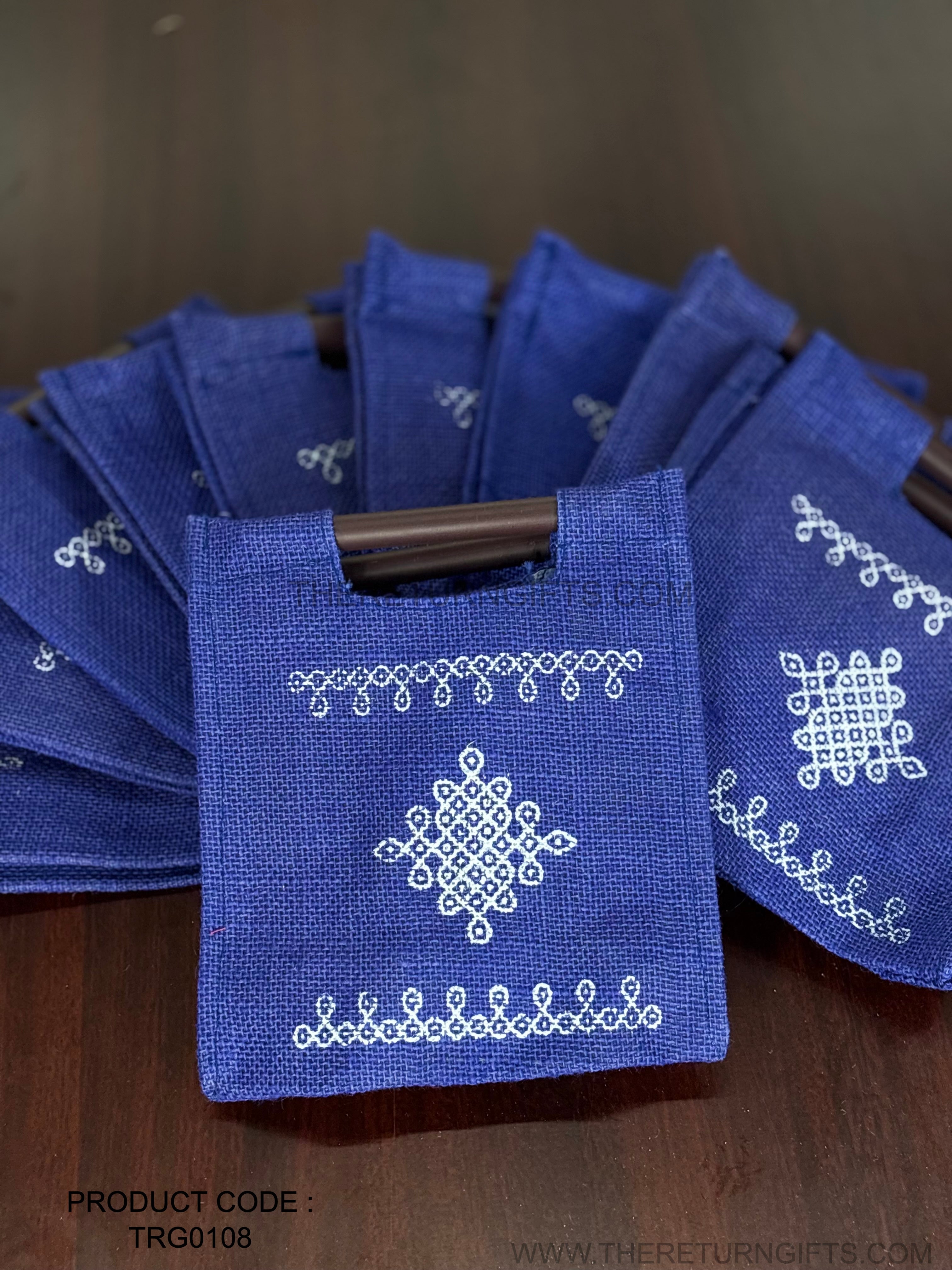 Blue Kolam Jute Bag with Wooden Handle Return Gift | TRG0108 | Handcrafted Kolam Print Jute Tote Under ₹100 | Traditional Wedding, Reception & Pooja Favor Bag