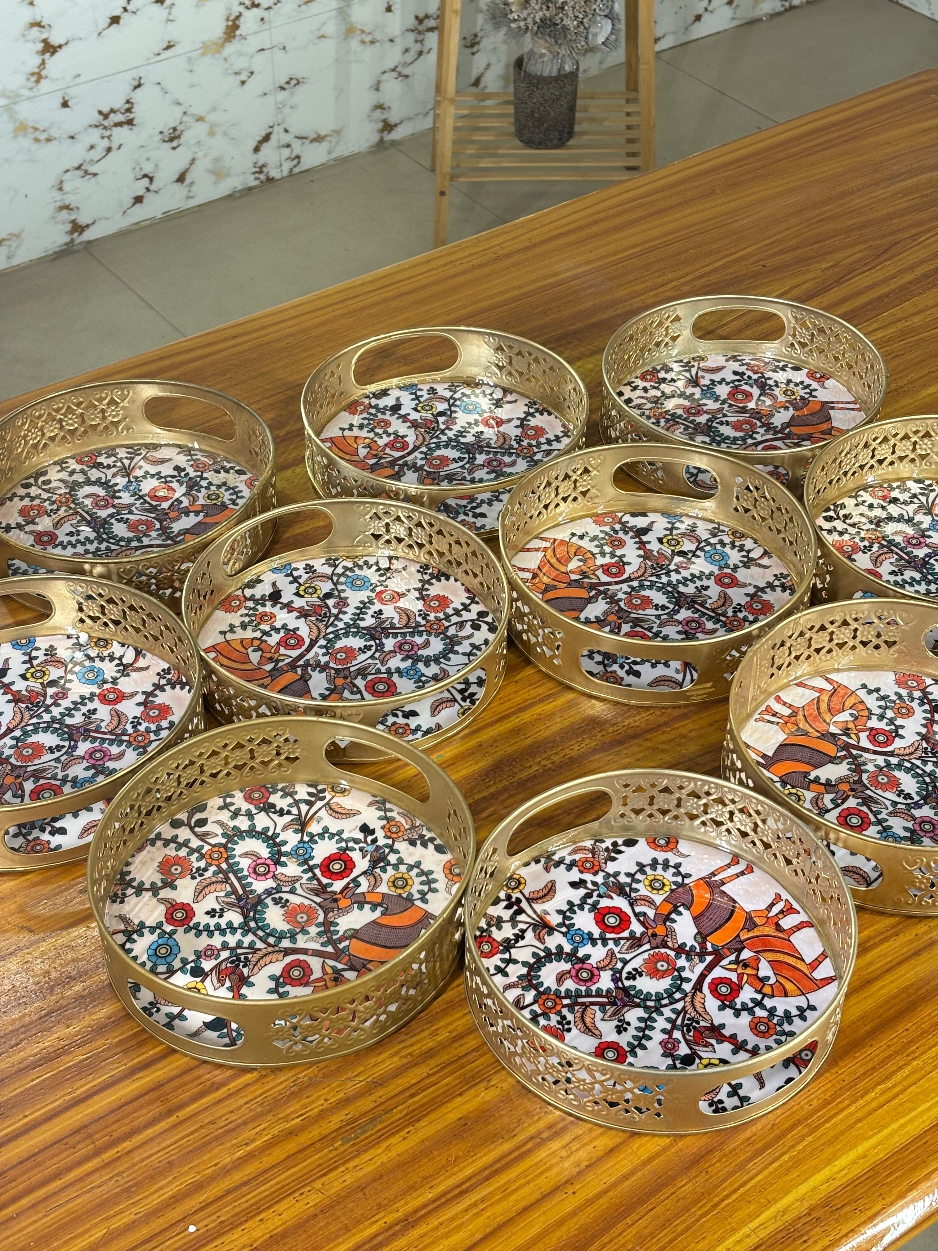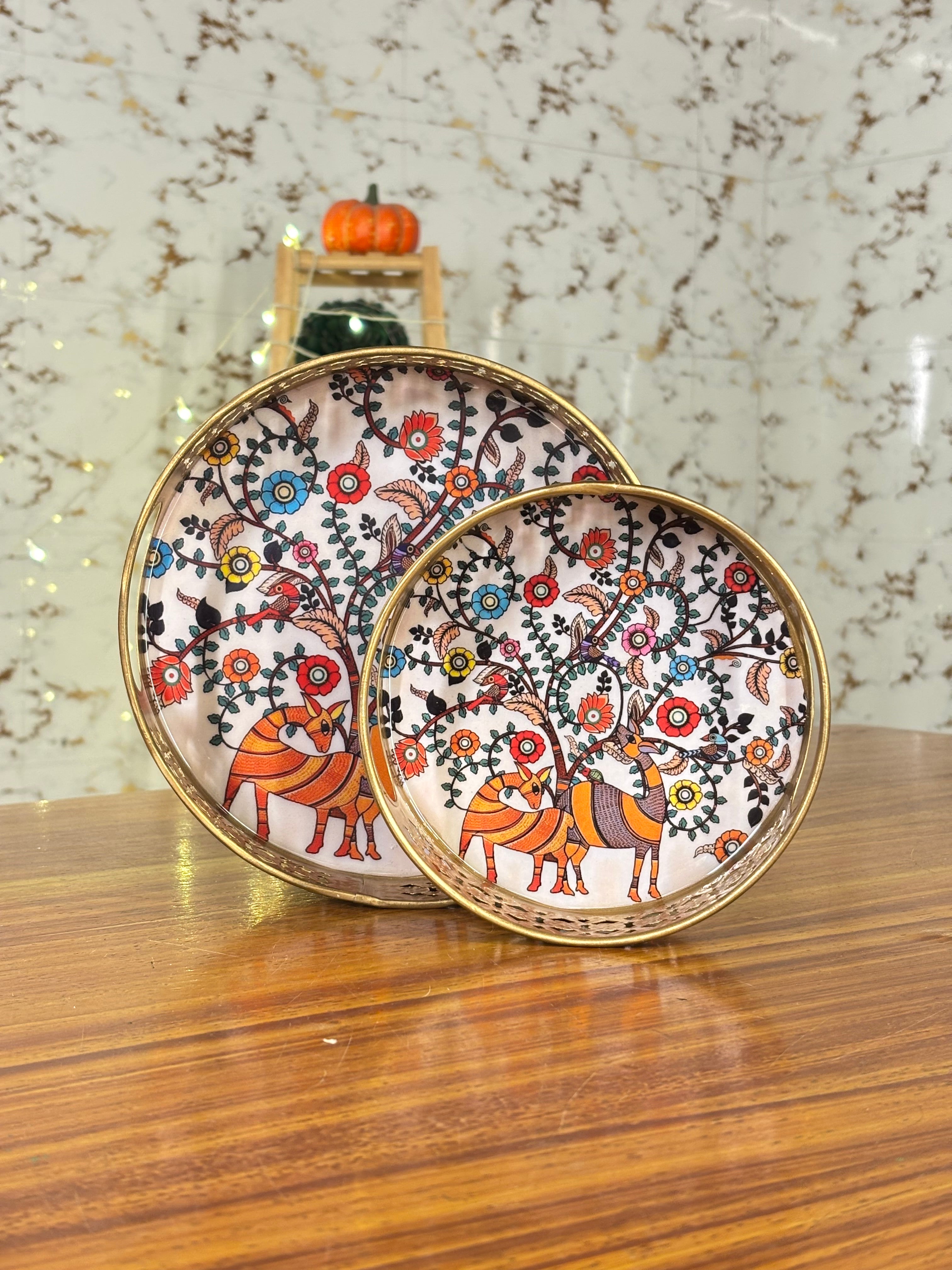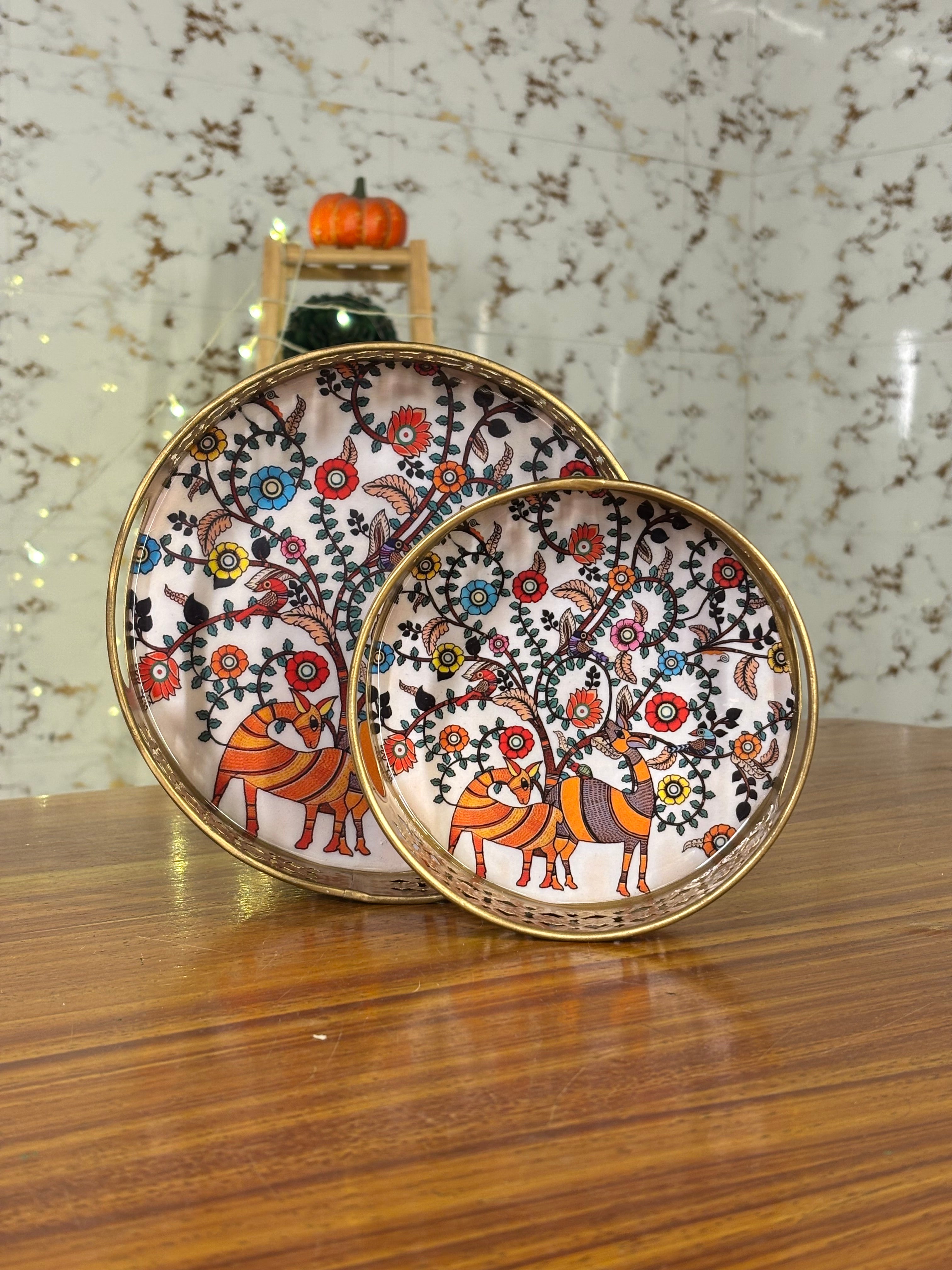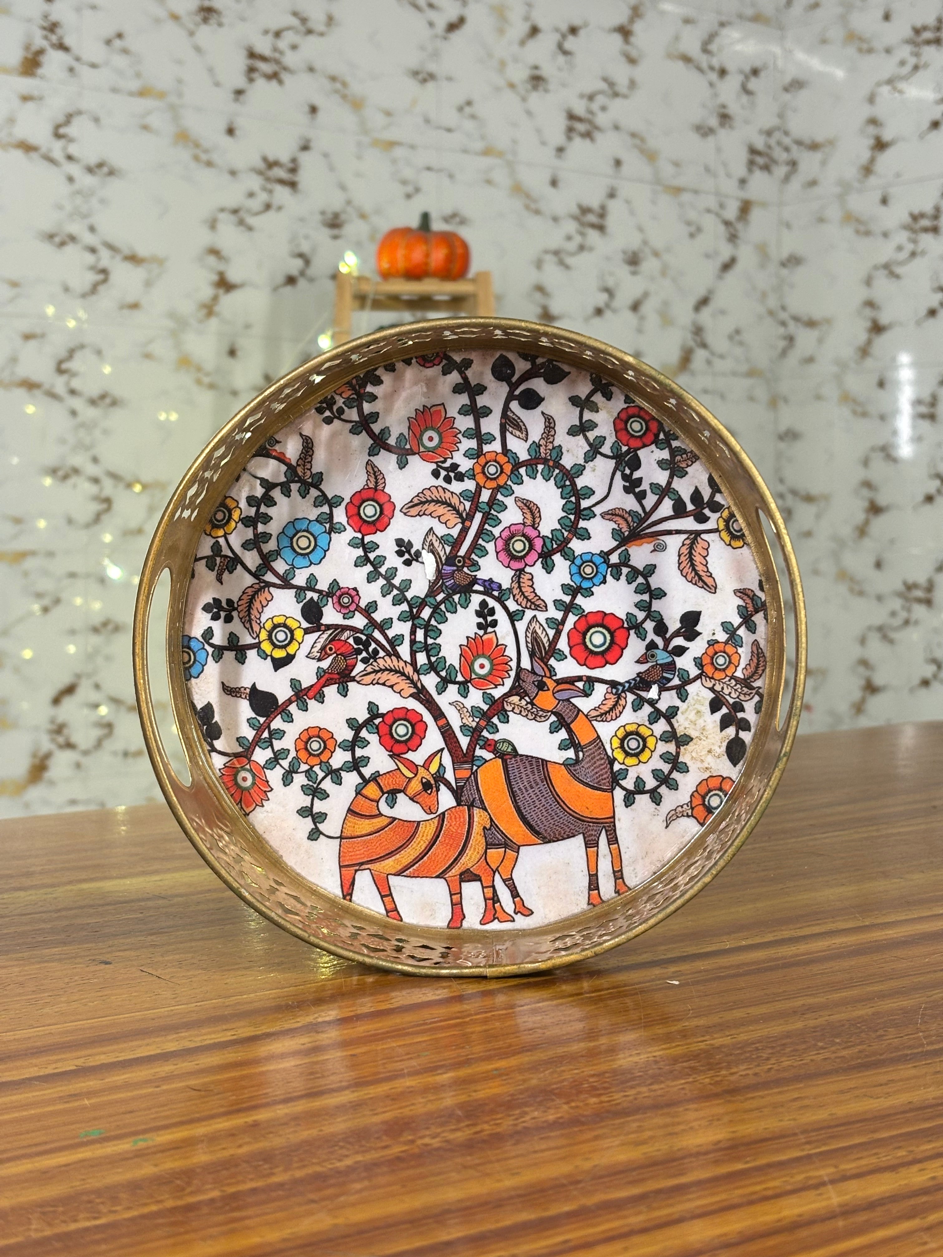 Tags: decorative tray, madhubani tray, indian art tray, round metal tray, ethnic decor tray, festive return gift tray, traditional indian tray, wedding hamper tray