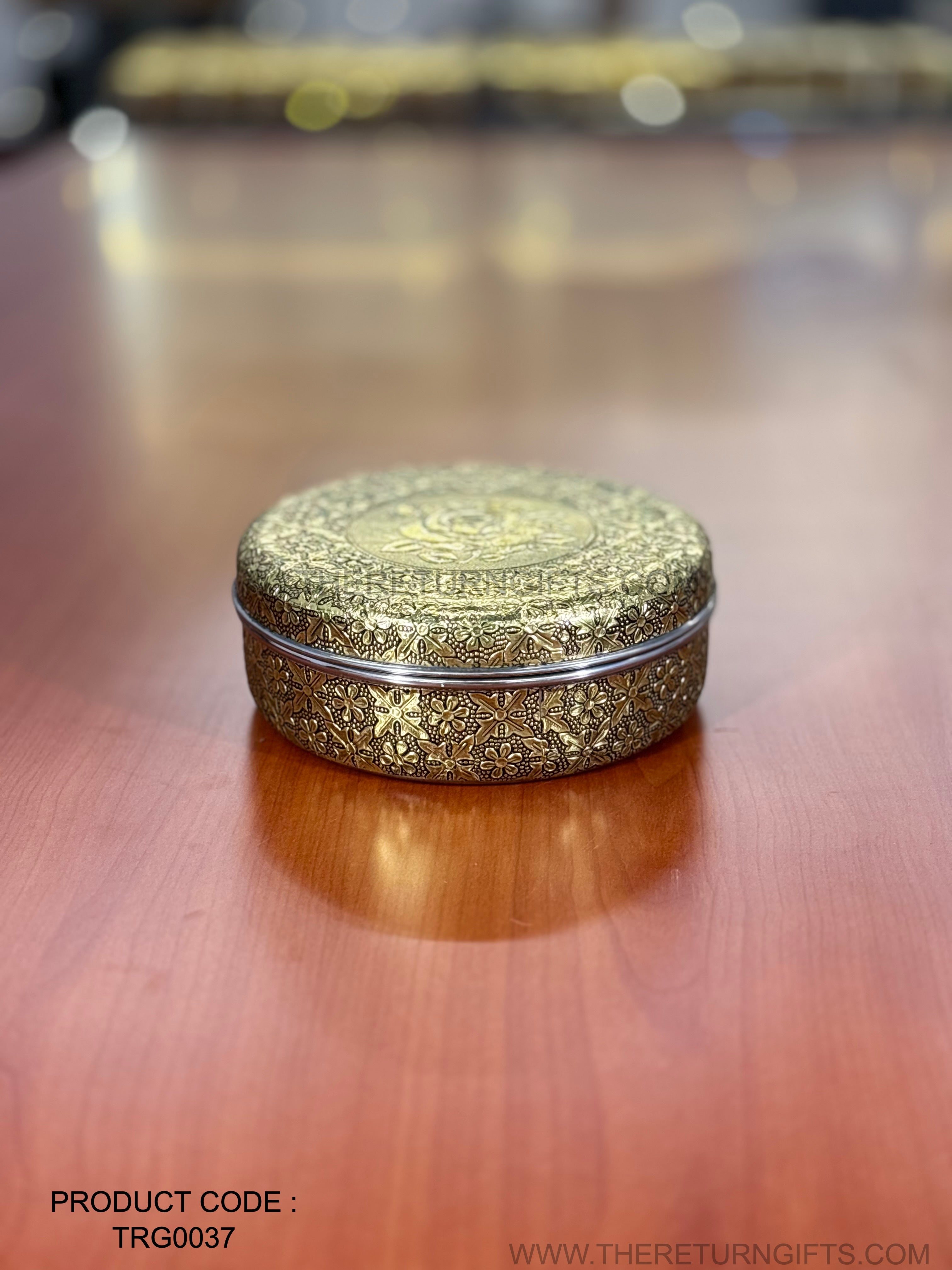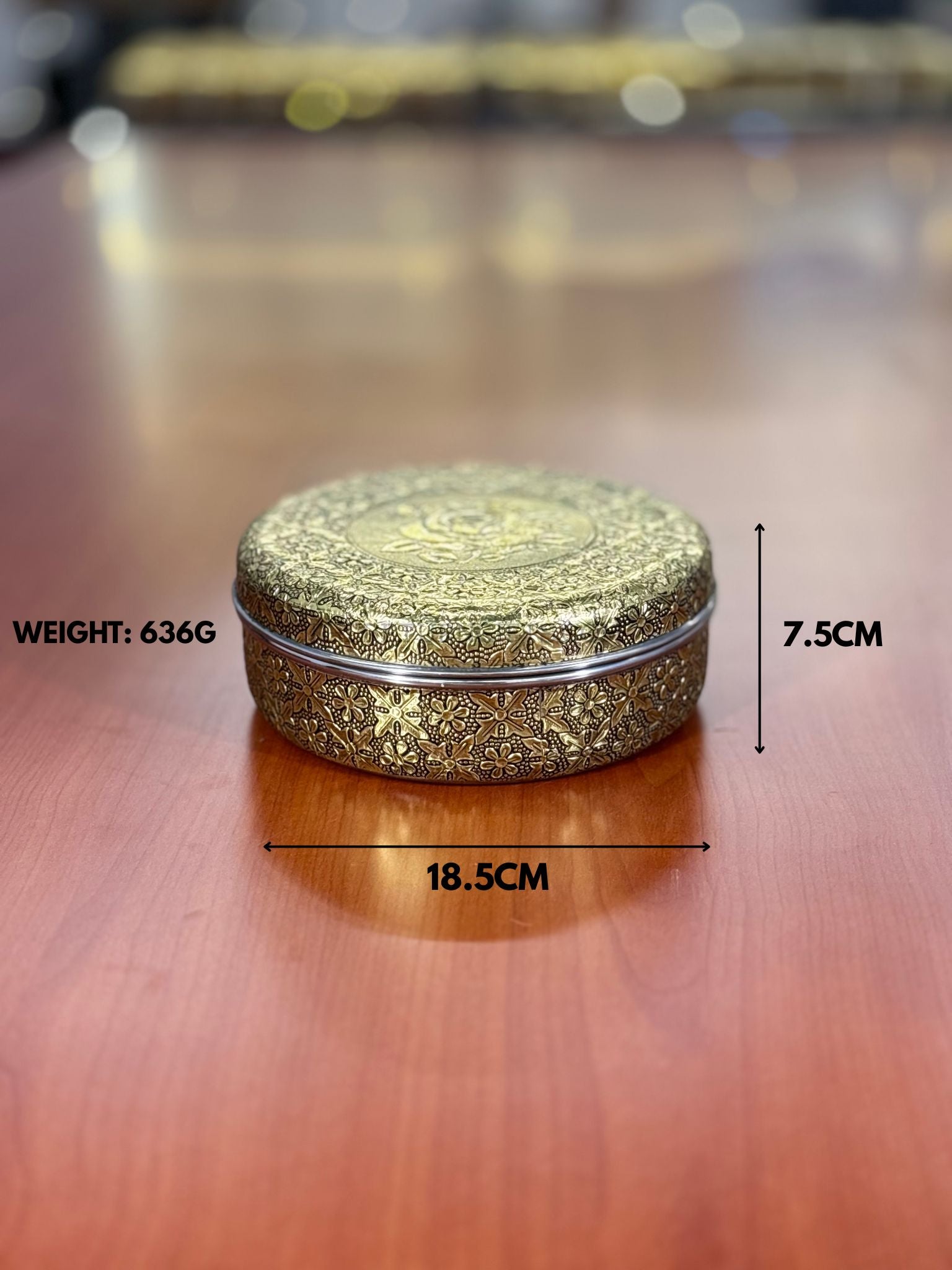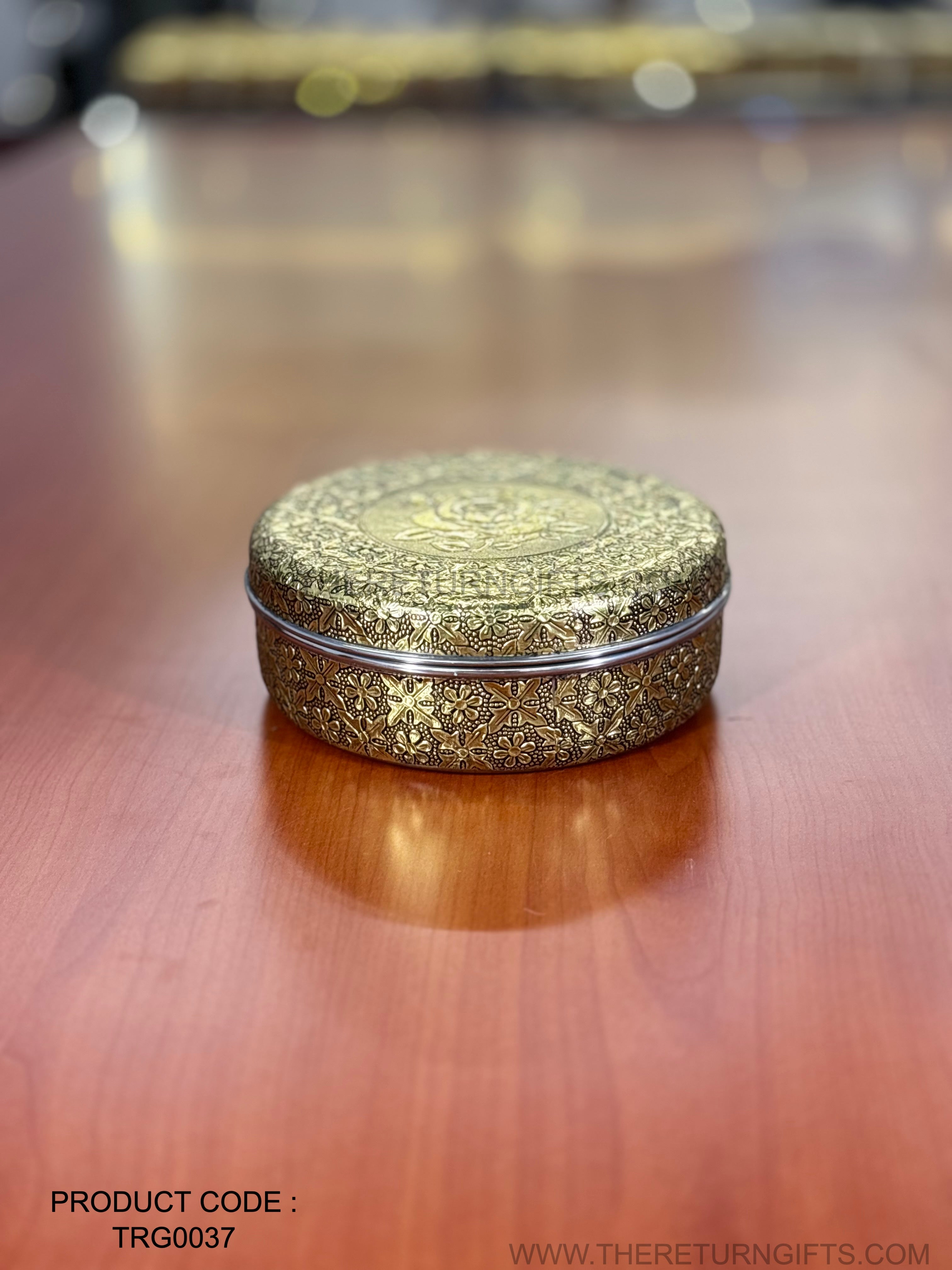 Gold Floral Round Spice Box | TRG0037 | Gold Masala Dabba with Floral Engraved Lid, 7 Inner Cups & Spoon Under ₹500 | Elegant Kitchen Spice Organizer & Festive Return Gift