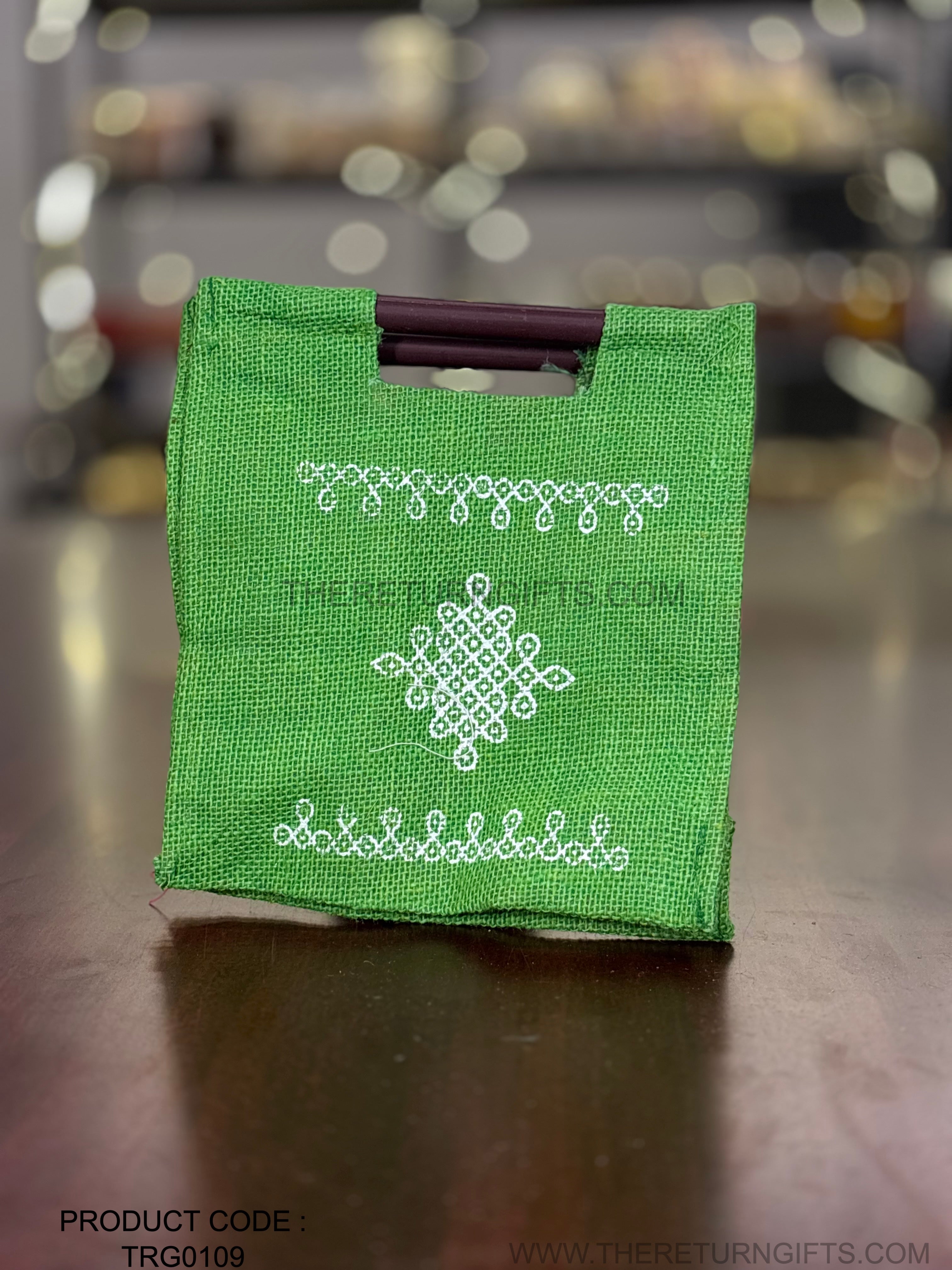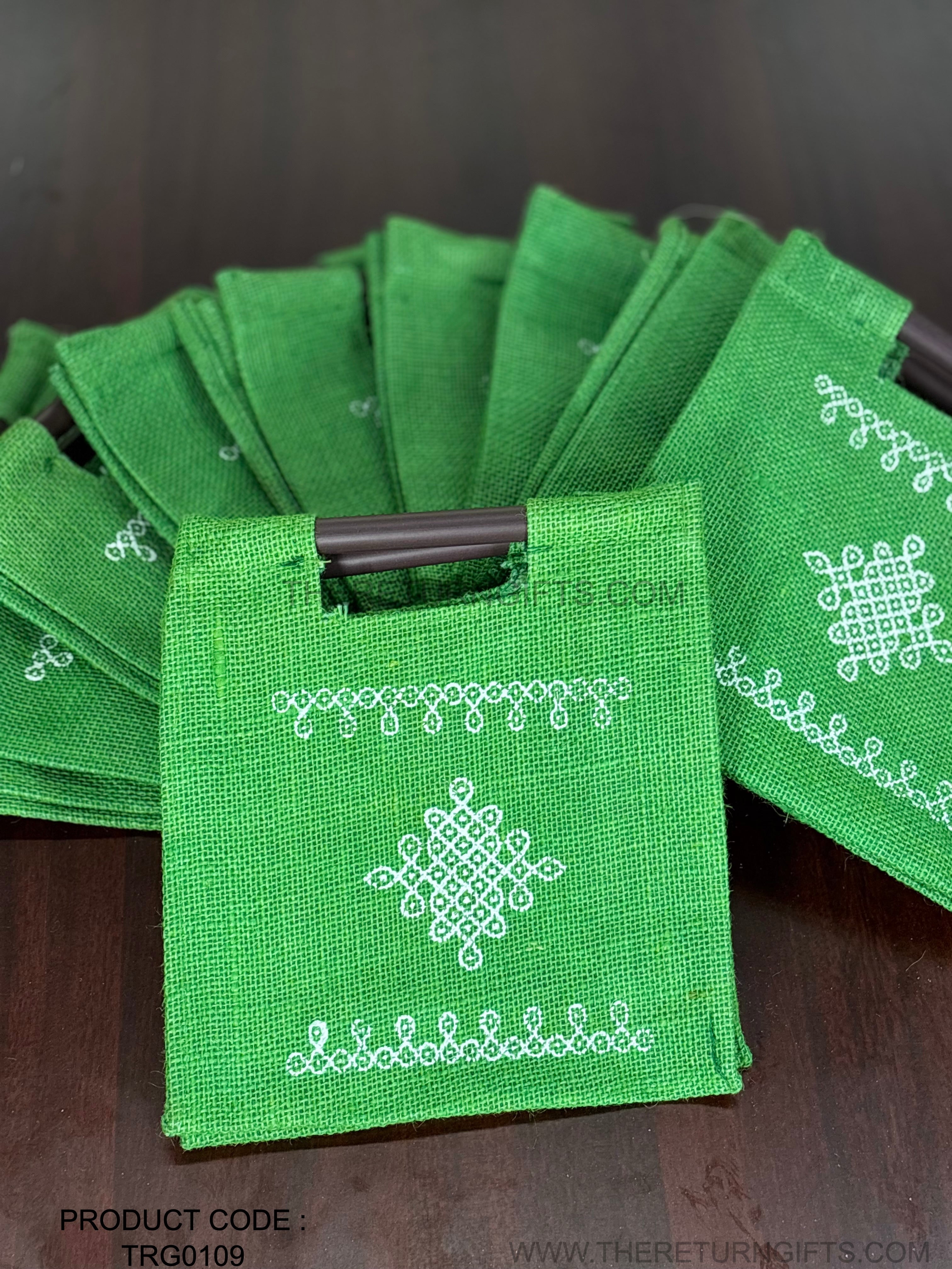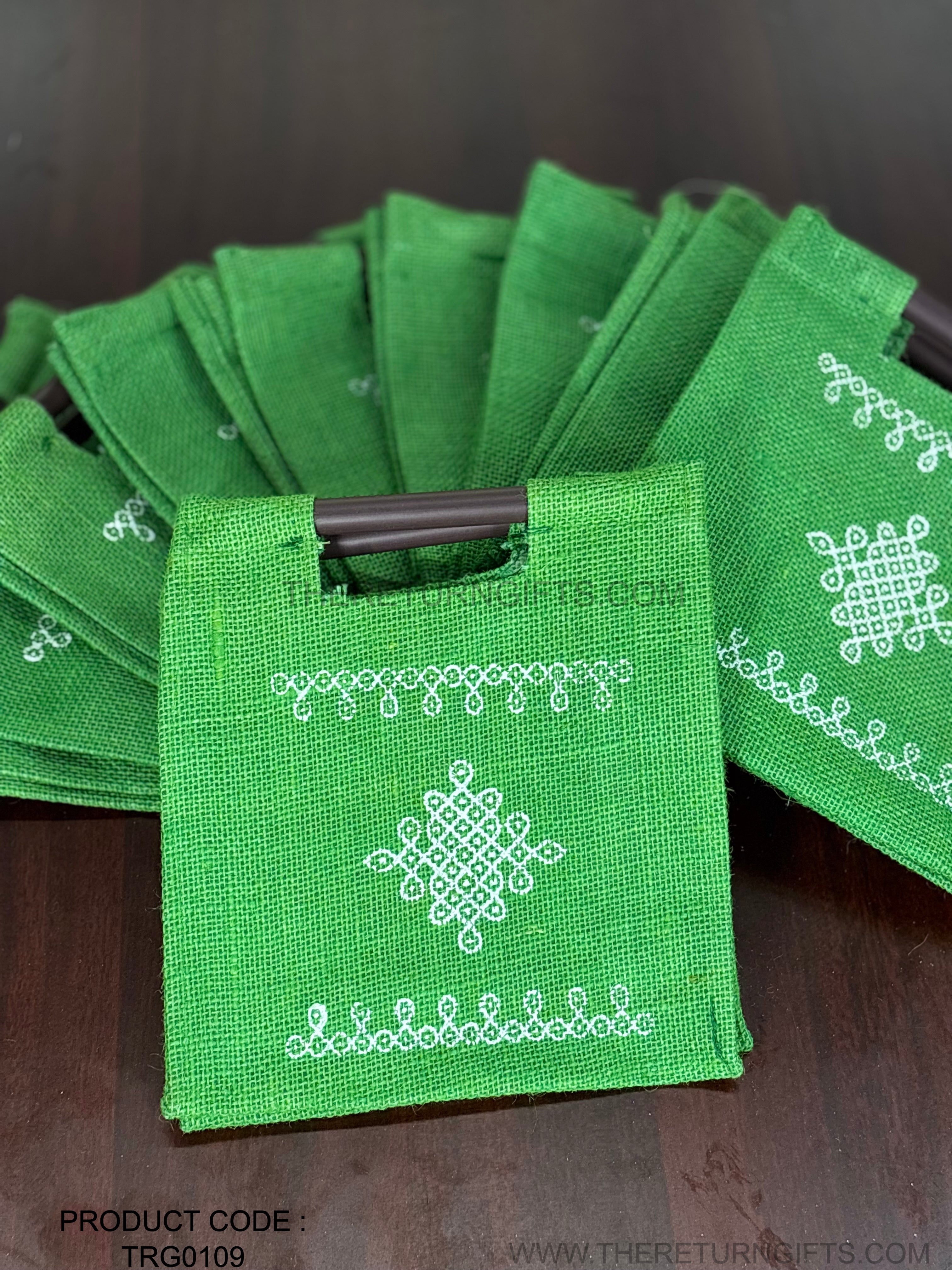 Green Kolam Jute Bag with Wooden Handle Return Gift | TRG0109 | Handcrafted Kolam Print Jute Tote Under ₹100 | Traditional Wedding, Navratri & Pooja Favor Bag
