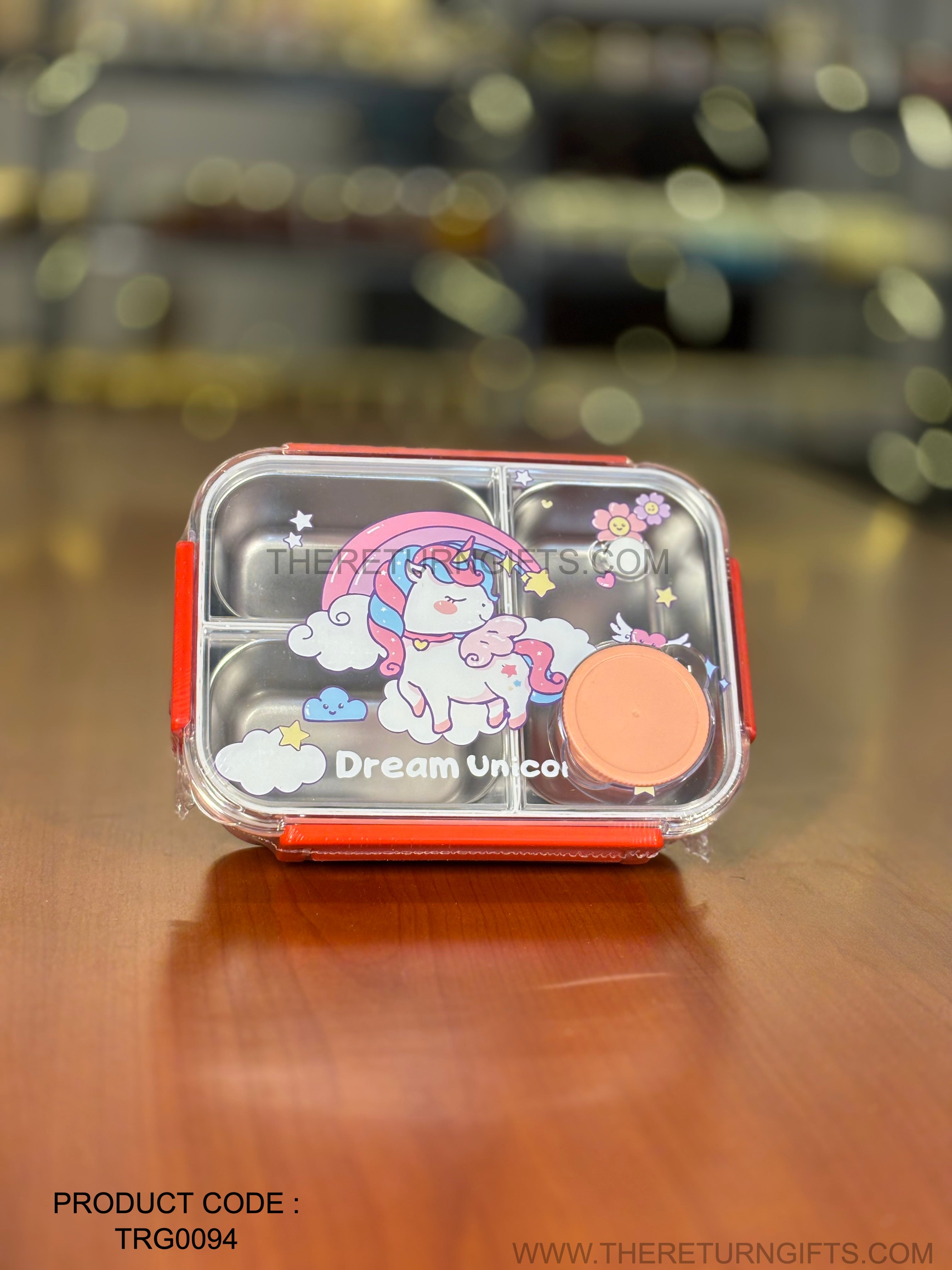 Kids Unicorn Stainless Steel Lunch Box | TRG0094 | Leak‑Proof Unicorn Theme Tiffin with 3 Compartments & Spoon for School Kids Under ₹600