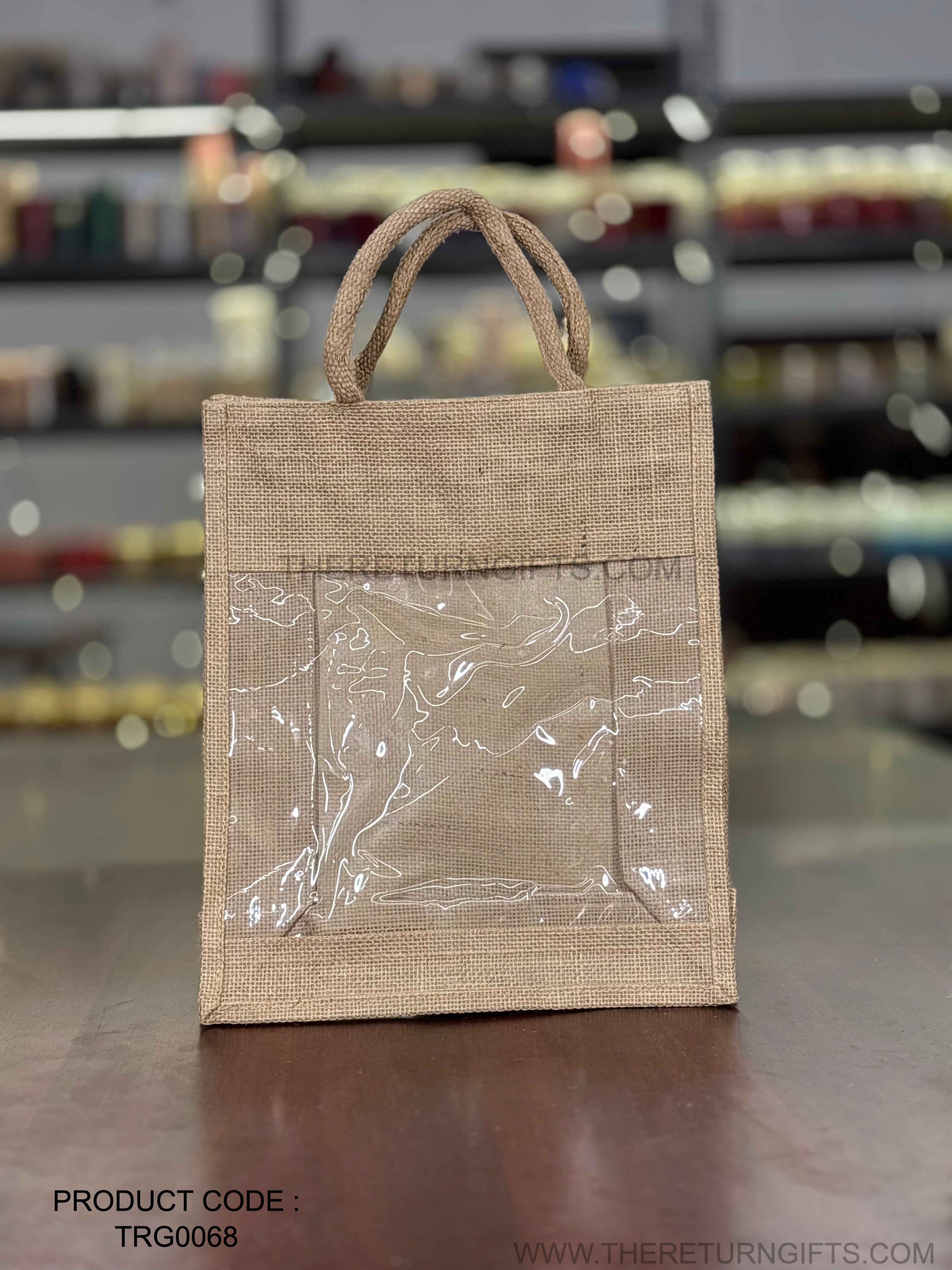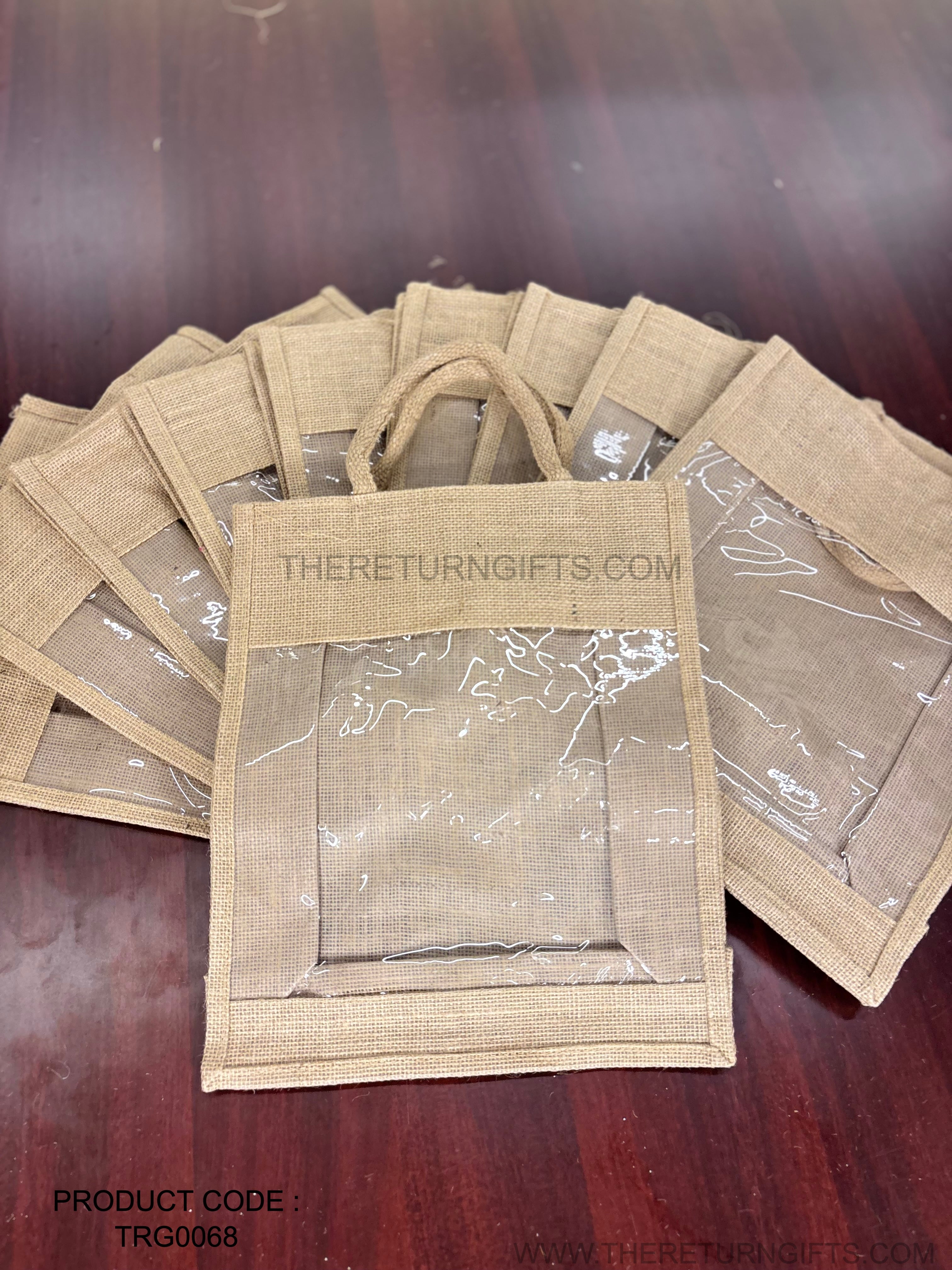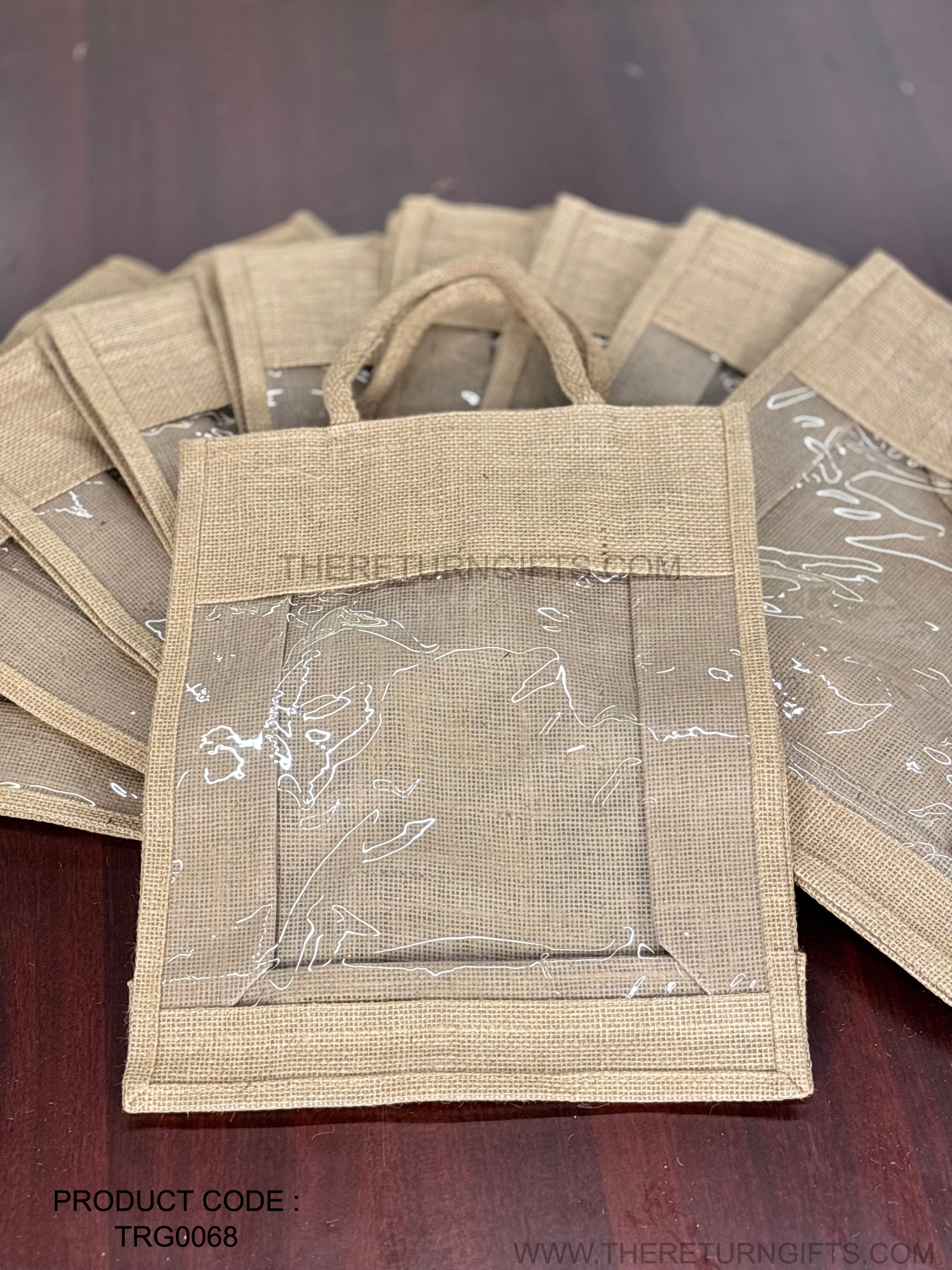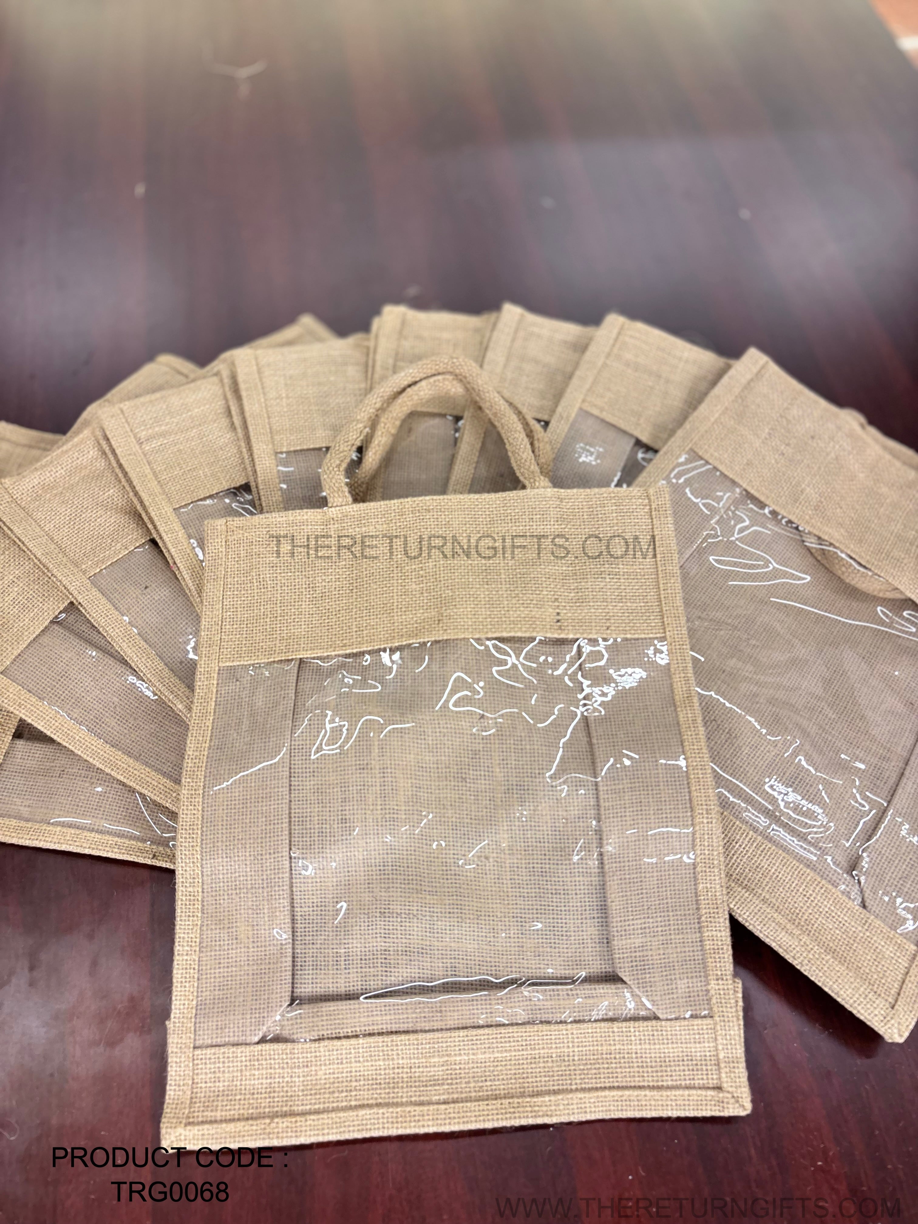 Natural Jute Bag with Transparent Front Return Gift L | TRG0068 | Large Jute Gift Hamper Bag with Window Under ₹150 | Eco‑Friendly Wedding, Housewarming & Festive Favor