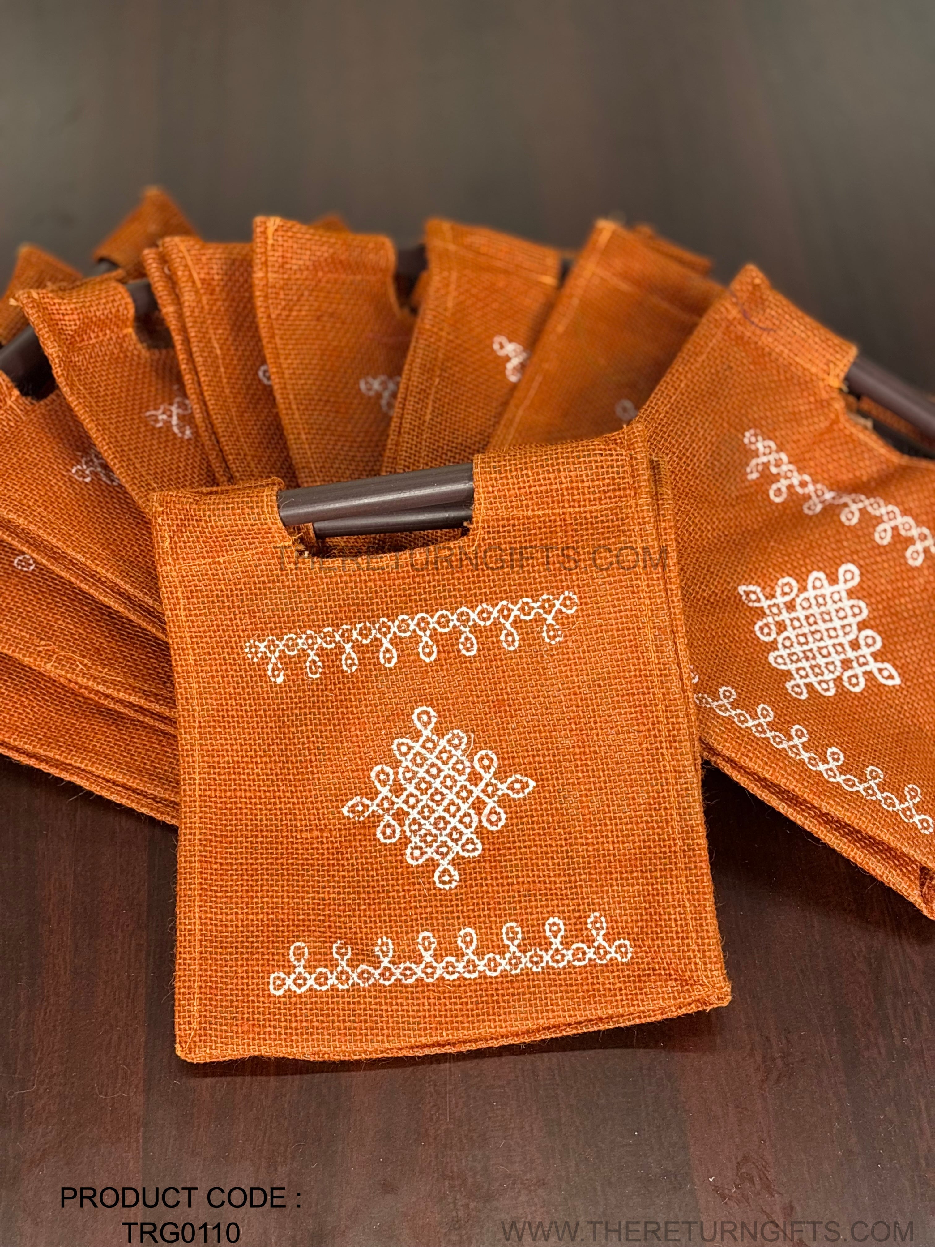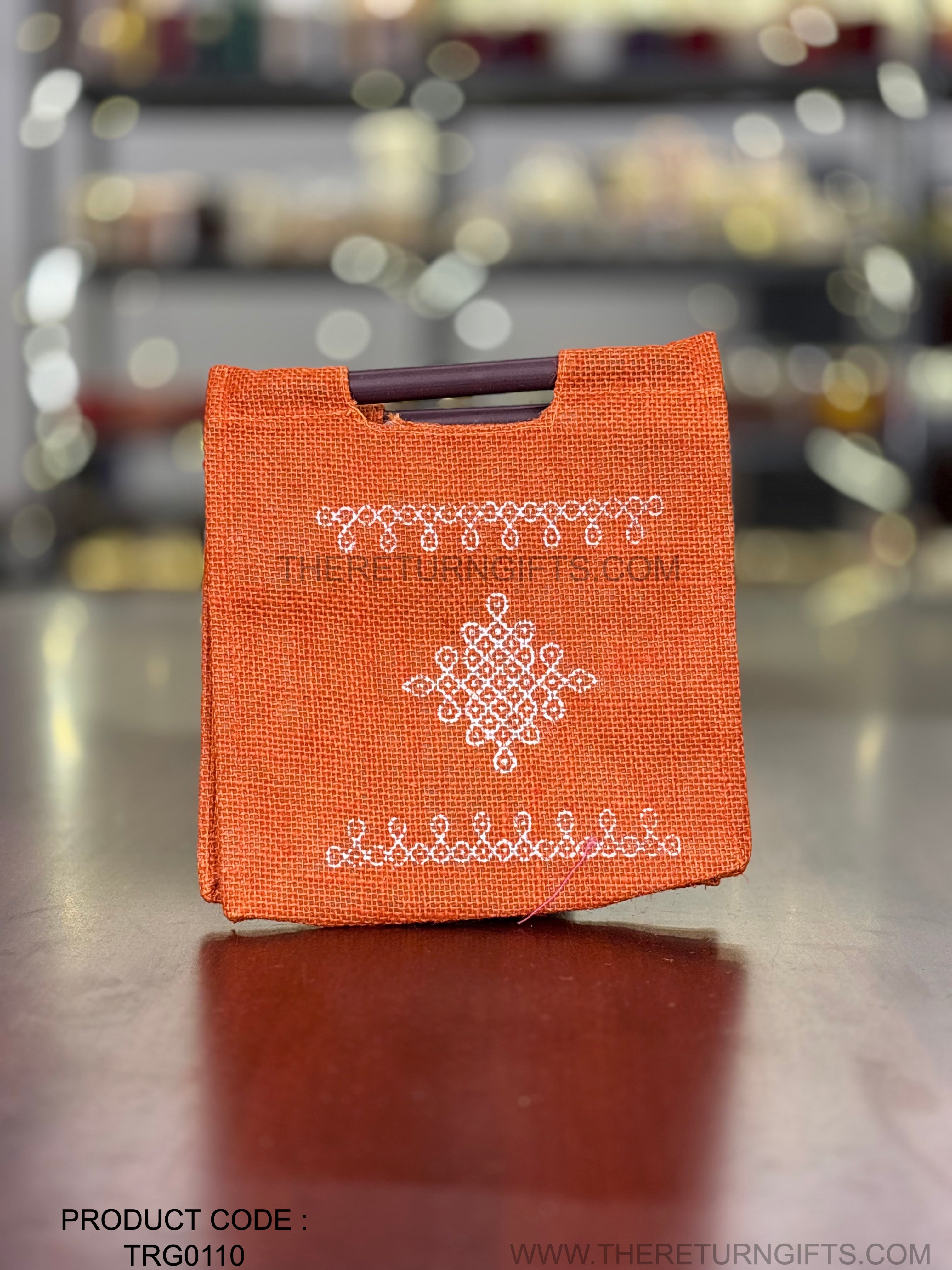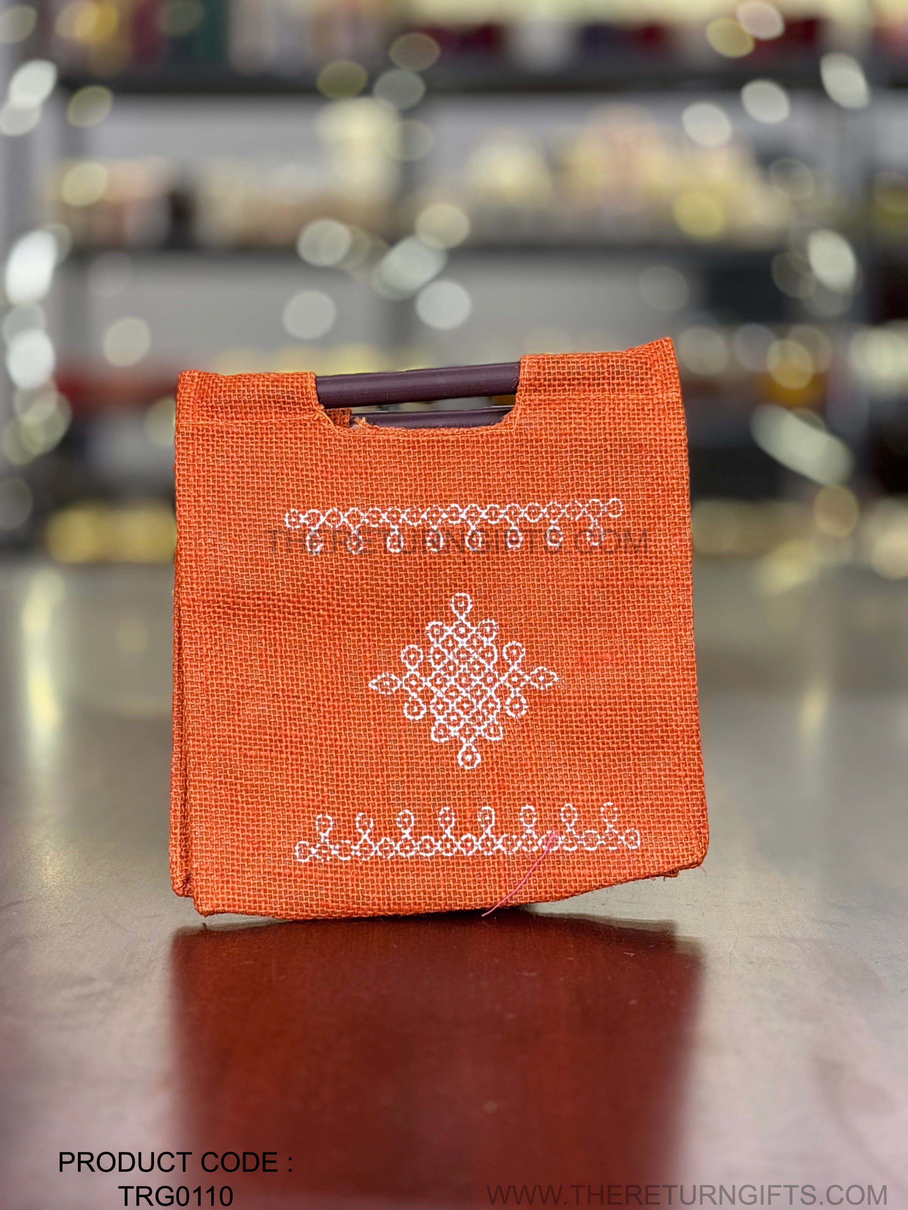 Orange Kolam Jute Bag with Wooden Handle Return Gift | TRG0110 | Handcrafted Kolam Print Jute Tote Under ₹100 | Traditional Wedding, Navratri & Pooja Favor Bag