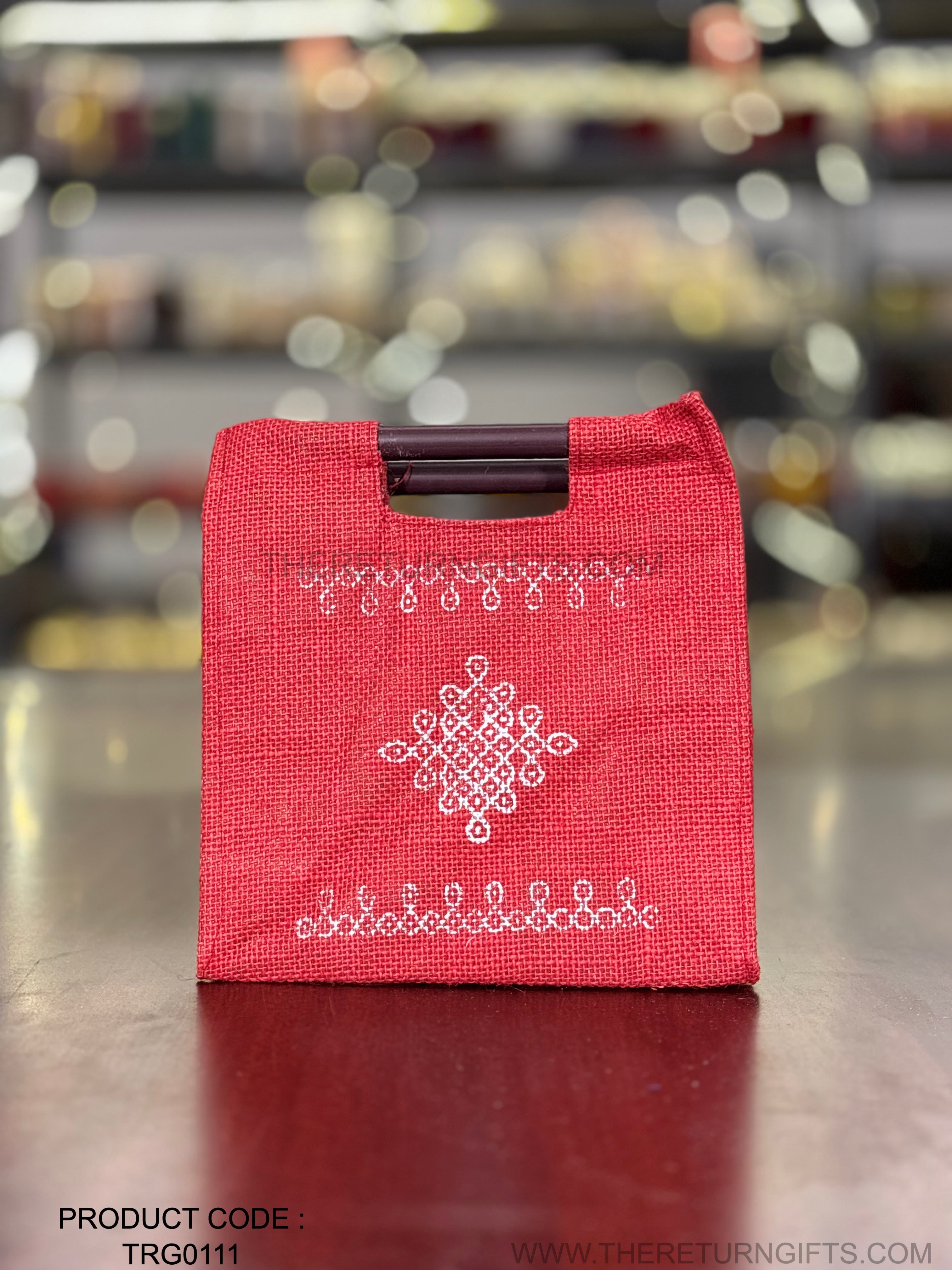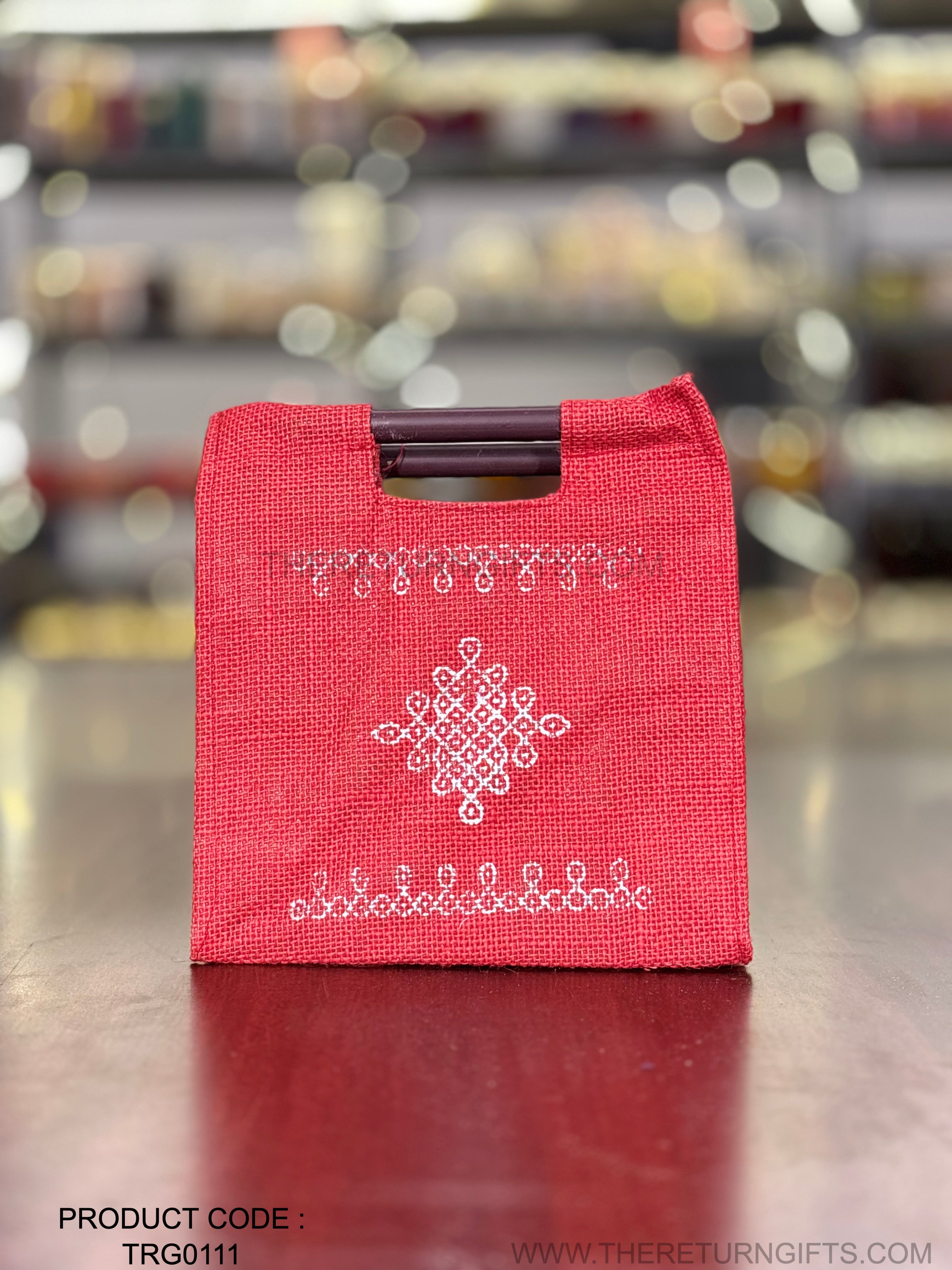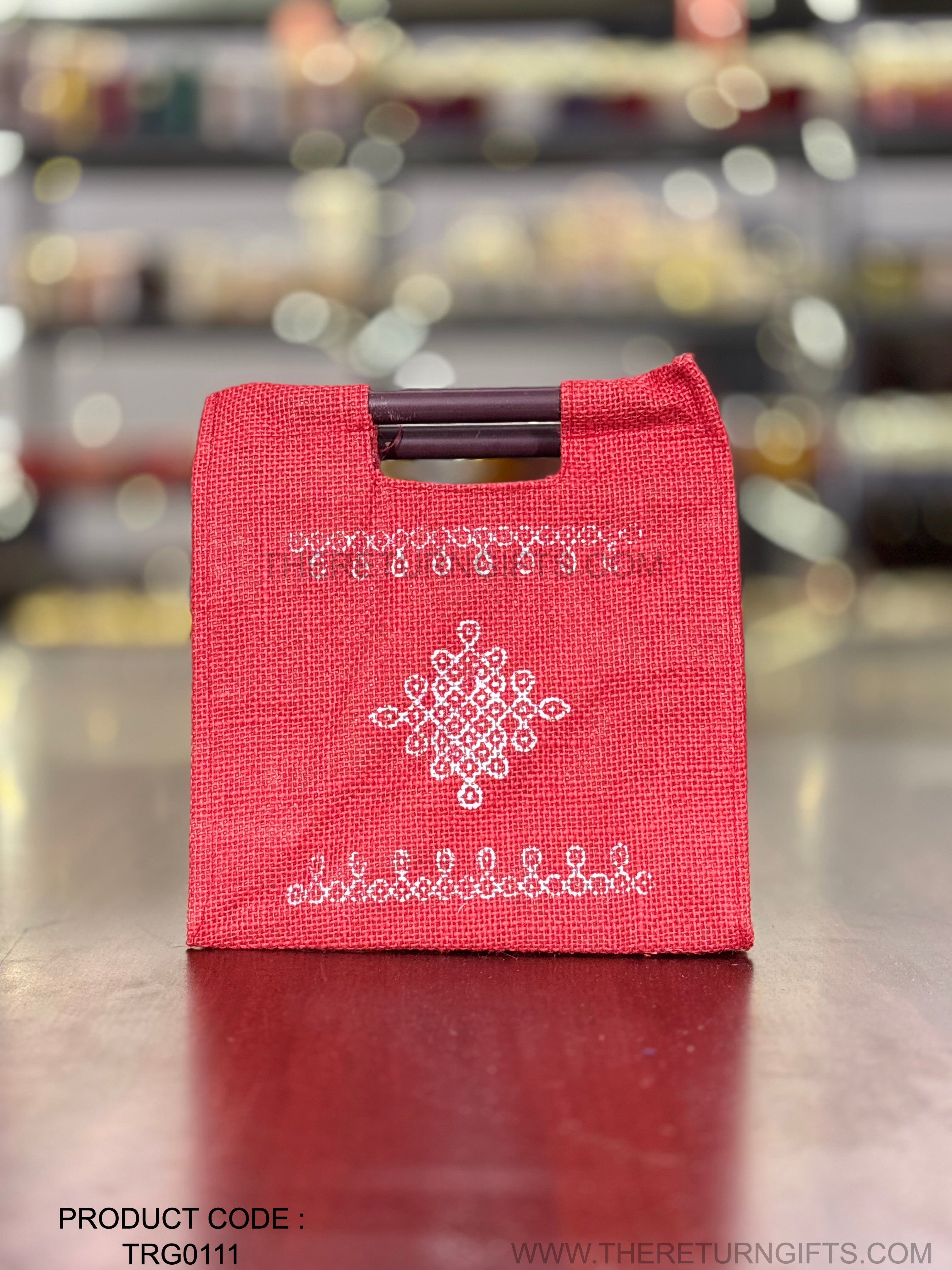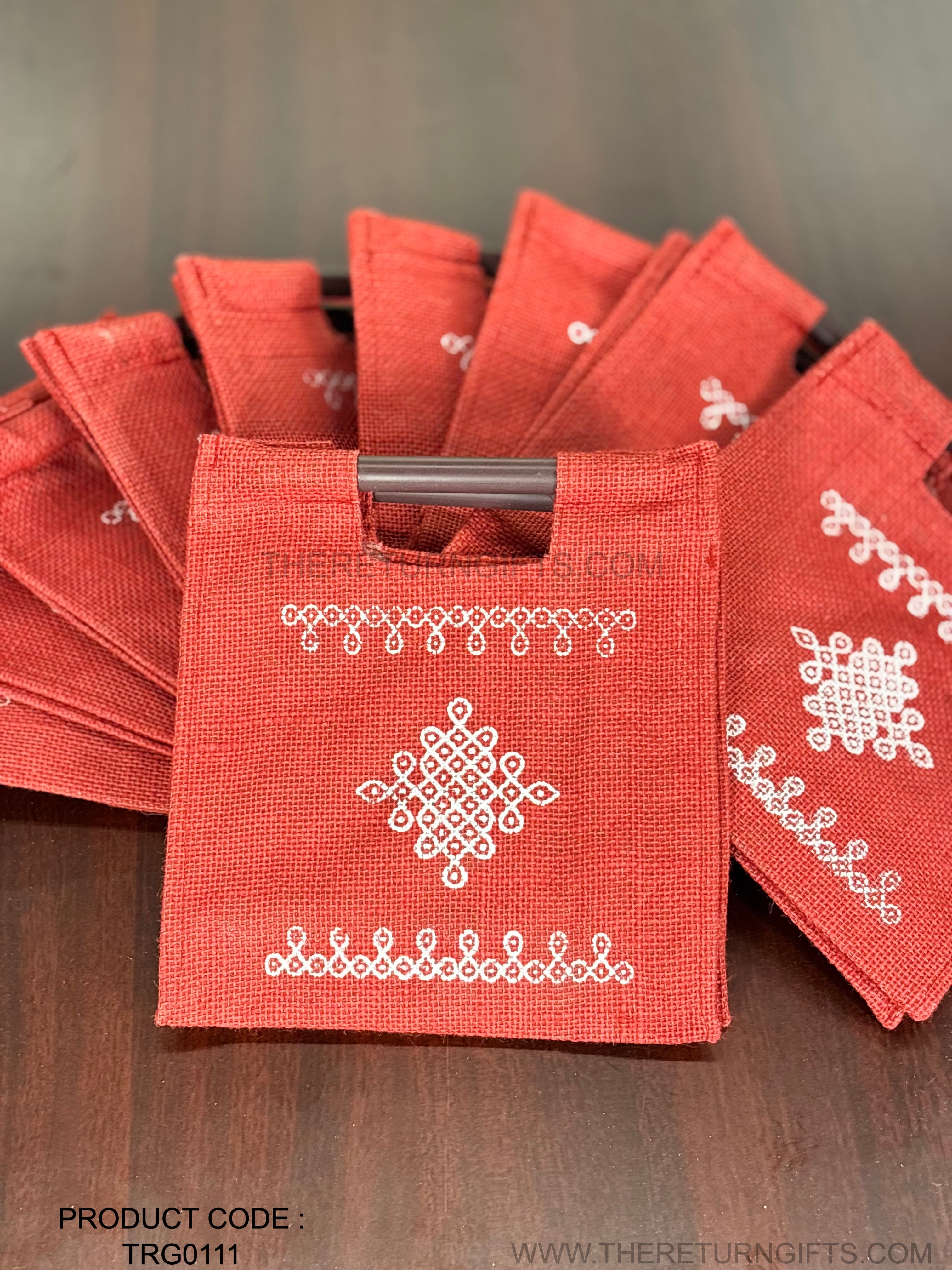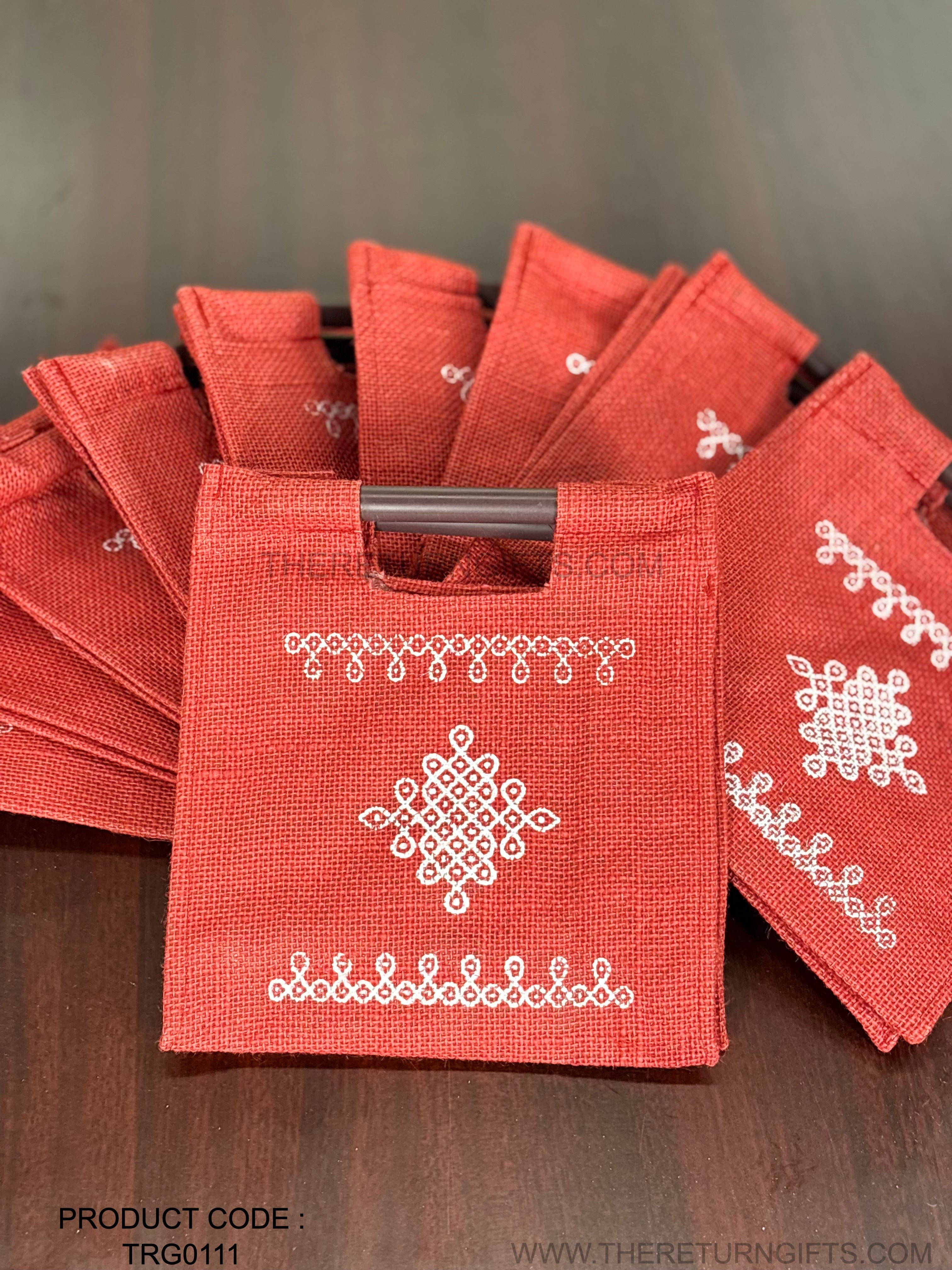 Red Kolam Jute Bag with Wooden Handle Return Gift | TRG0111 | Handcrafted Kolam Print Jute Tote Under ₹100 | Traditional Wedding, Seemantham & Pooja Favor Bag