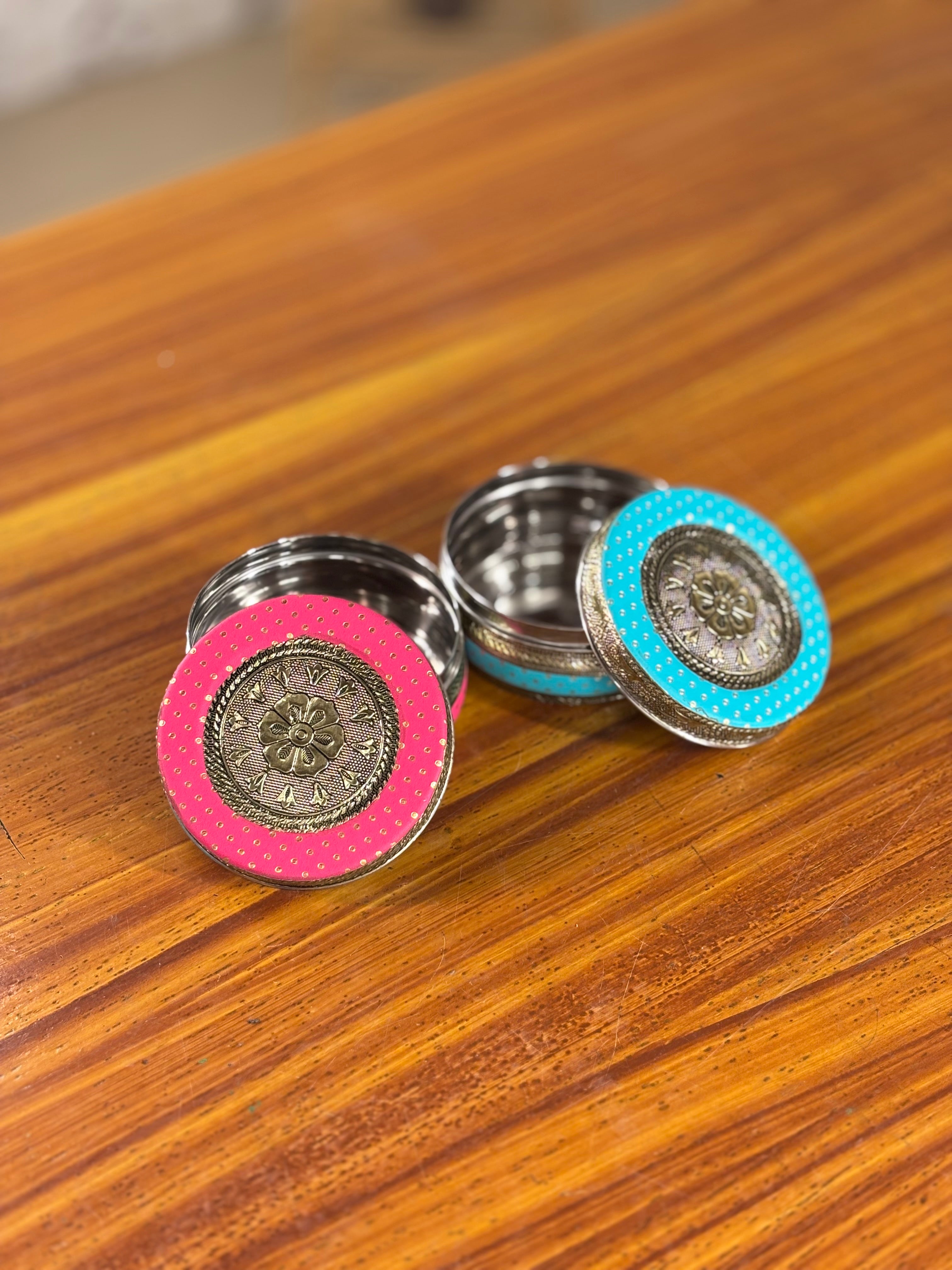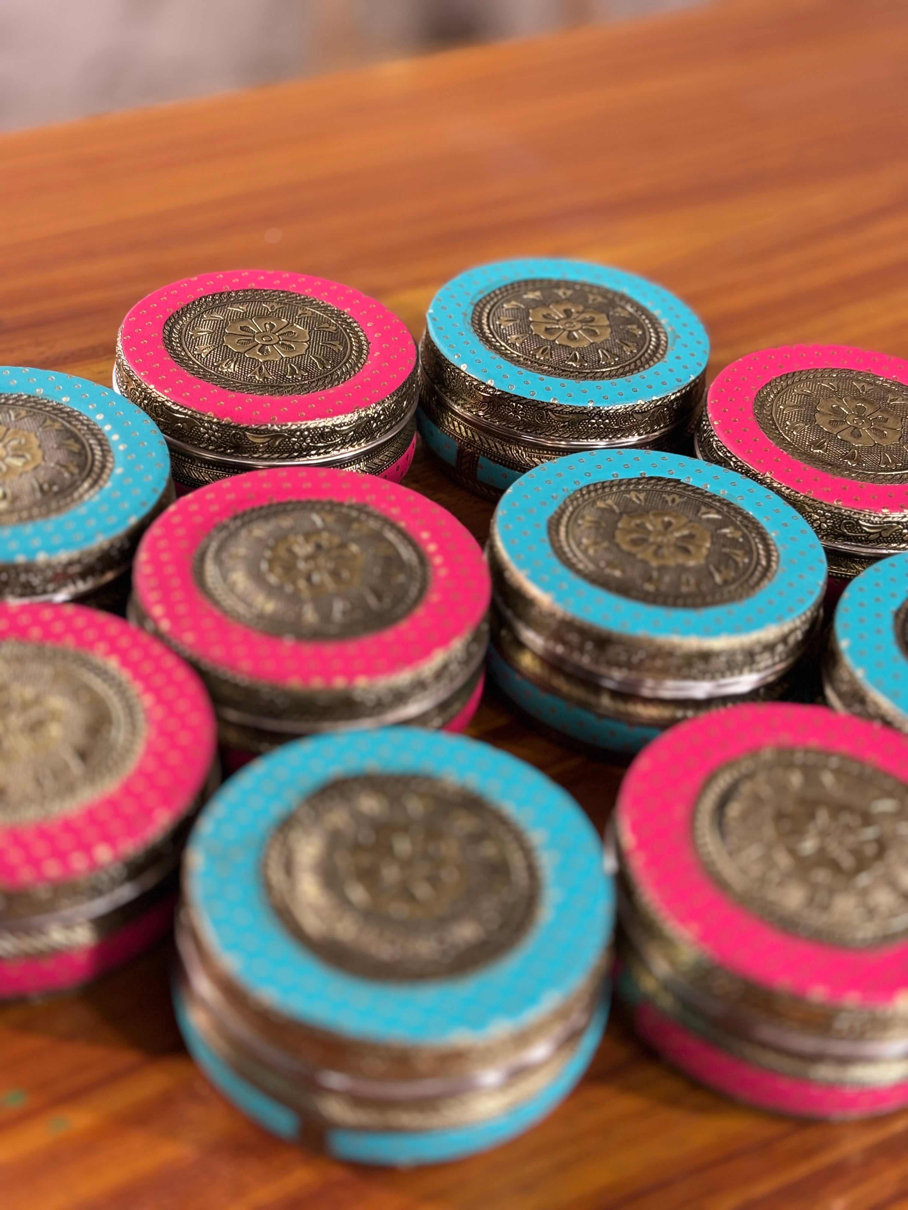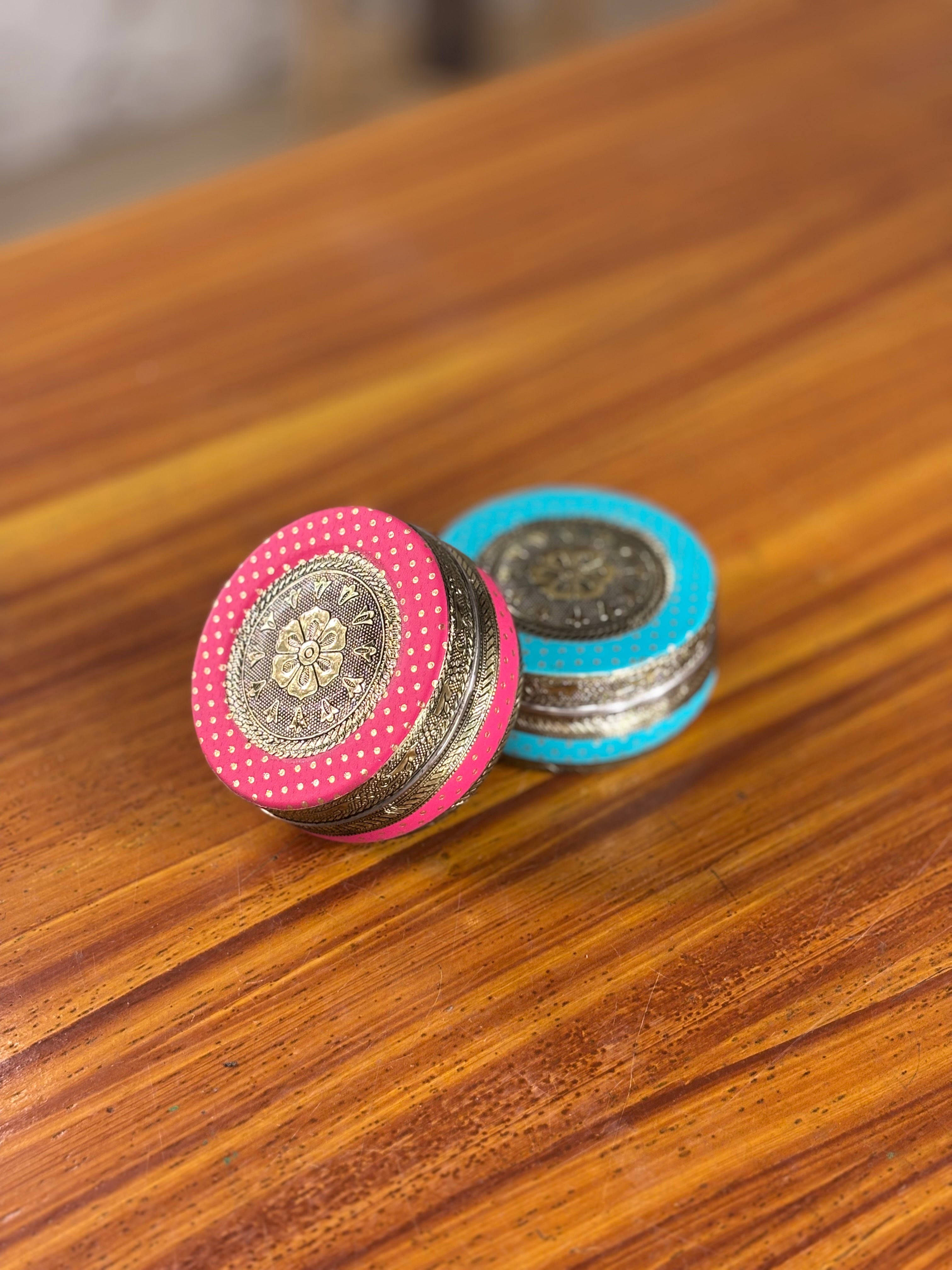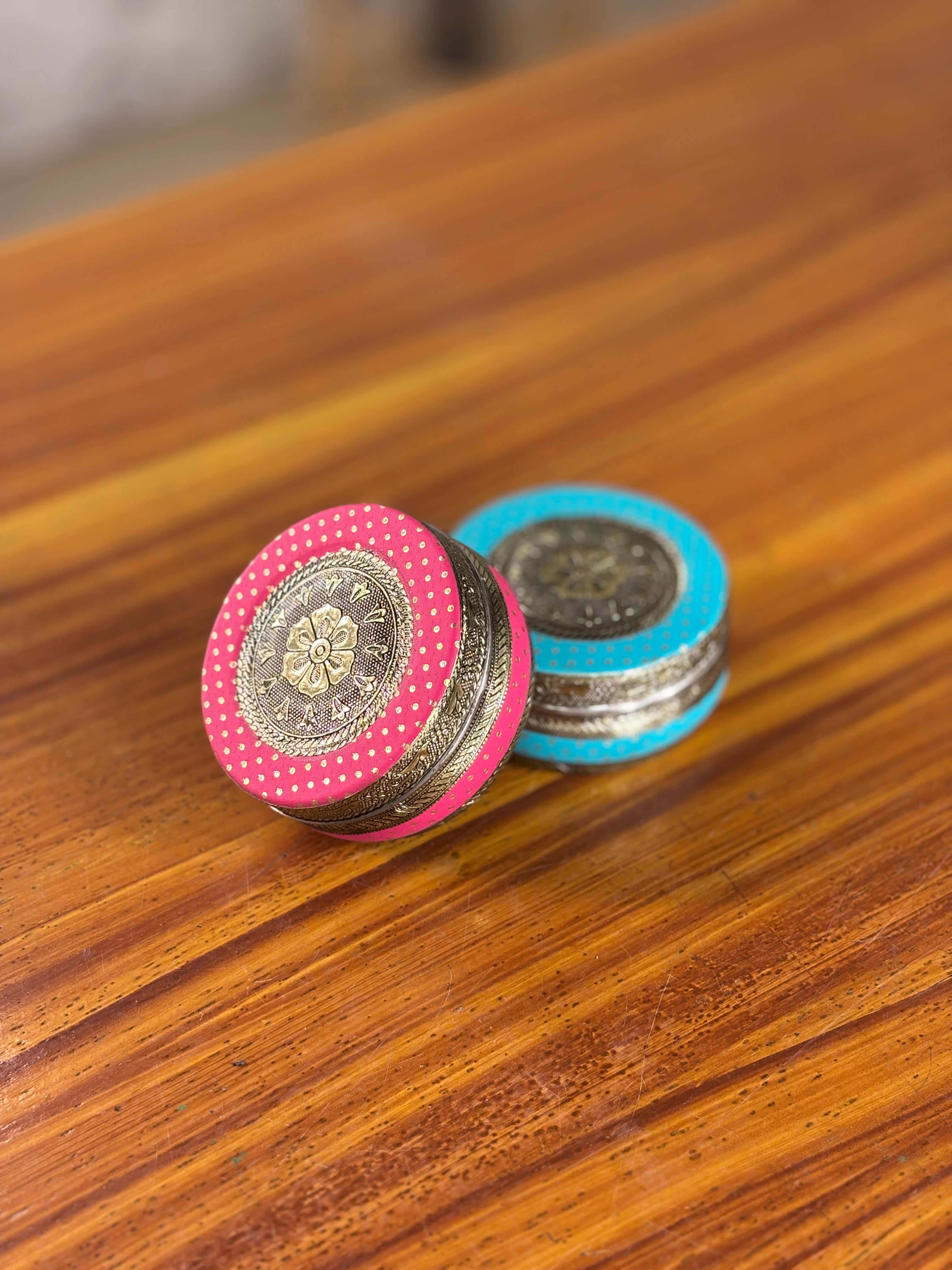 Add a touch of timeless charm to your celebrations with this Colorful Meenakari Round Box, beautifully handcrafted with intricate floral embossing and antique gold detailing. Available in vibrant pink and turquoise blue, this elegant piece is perfect for storing kumkum, chocolates, dry fruits, or tiny keepsakes.