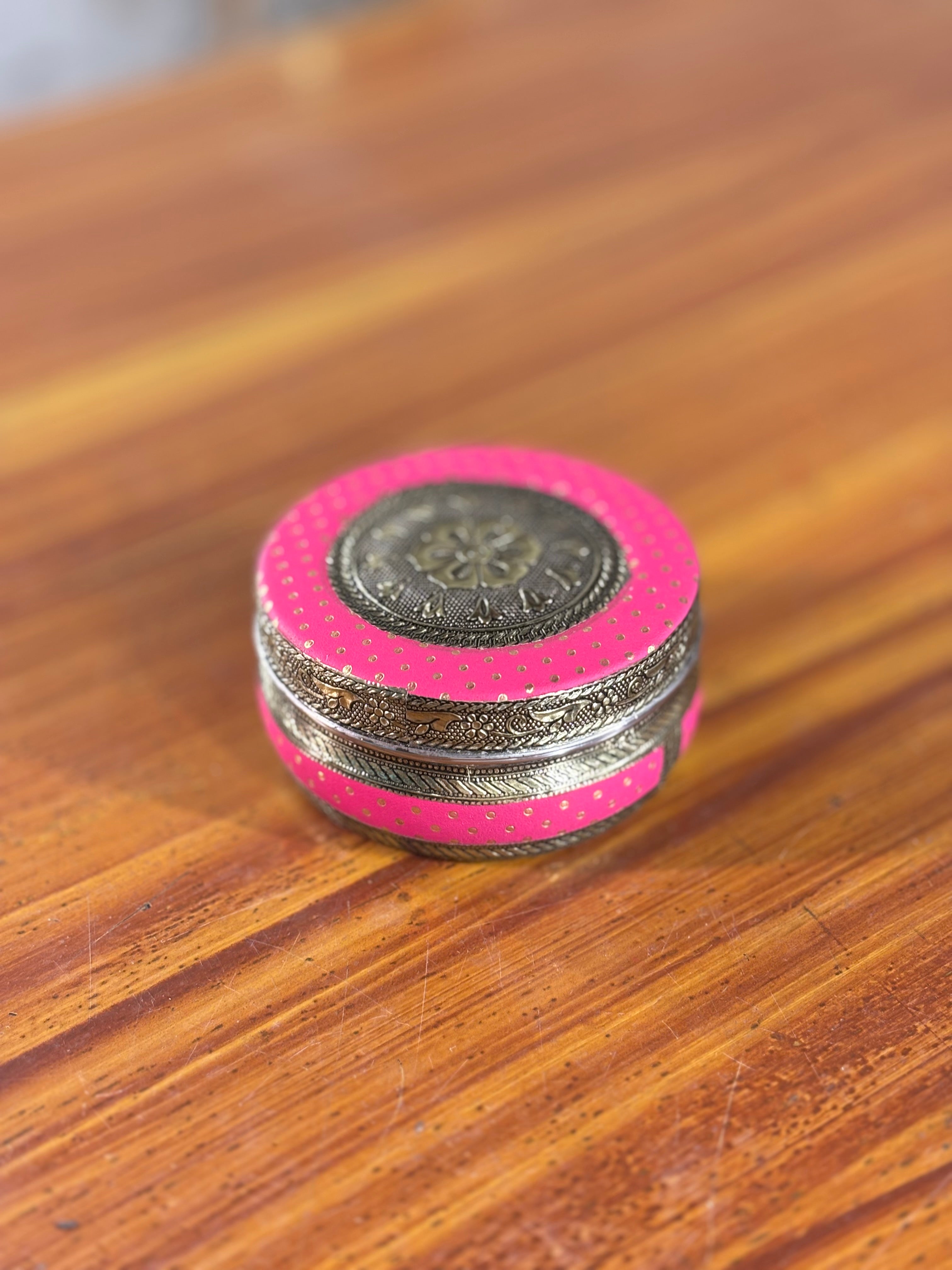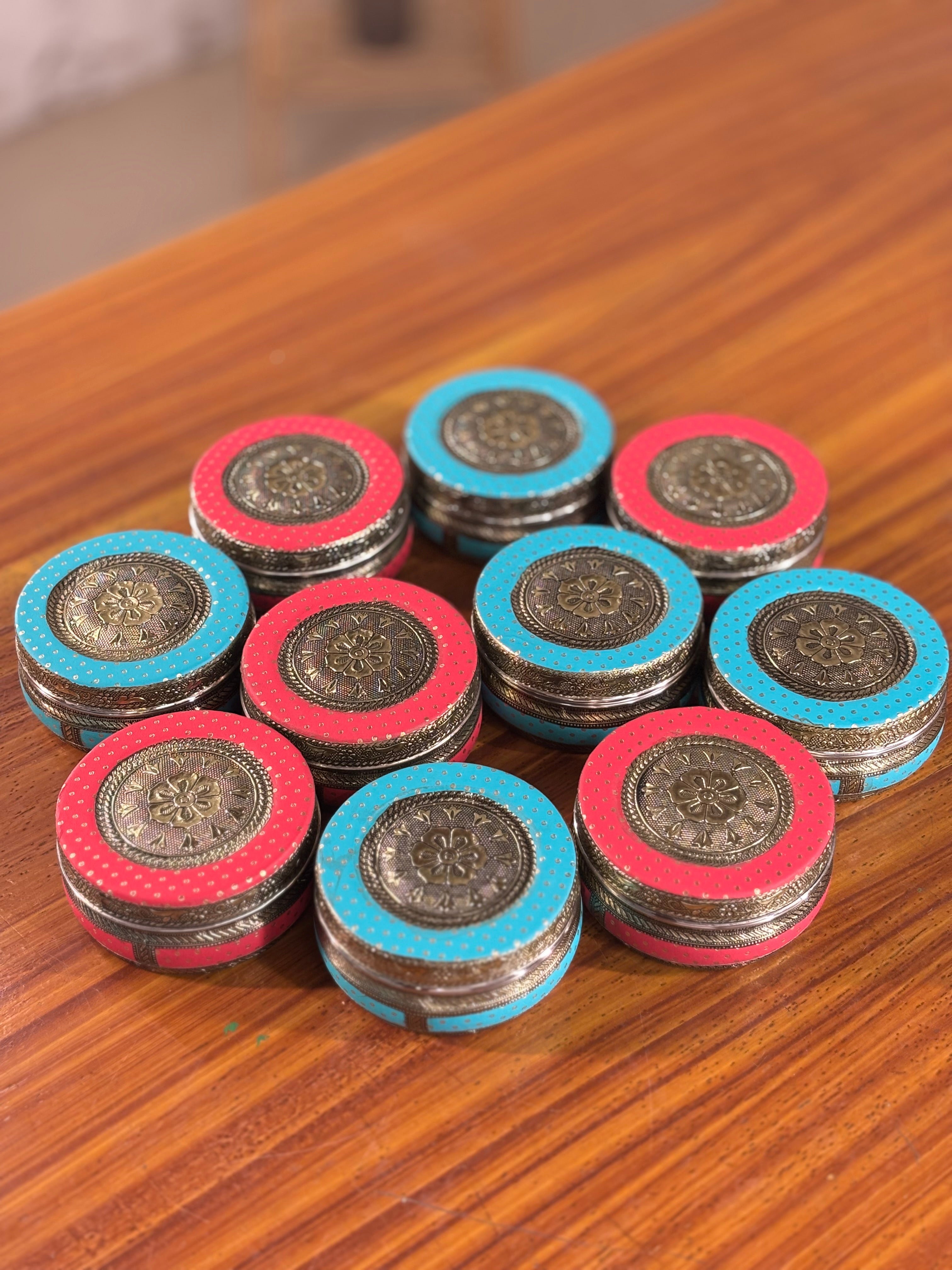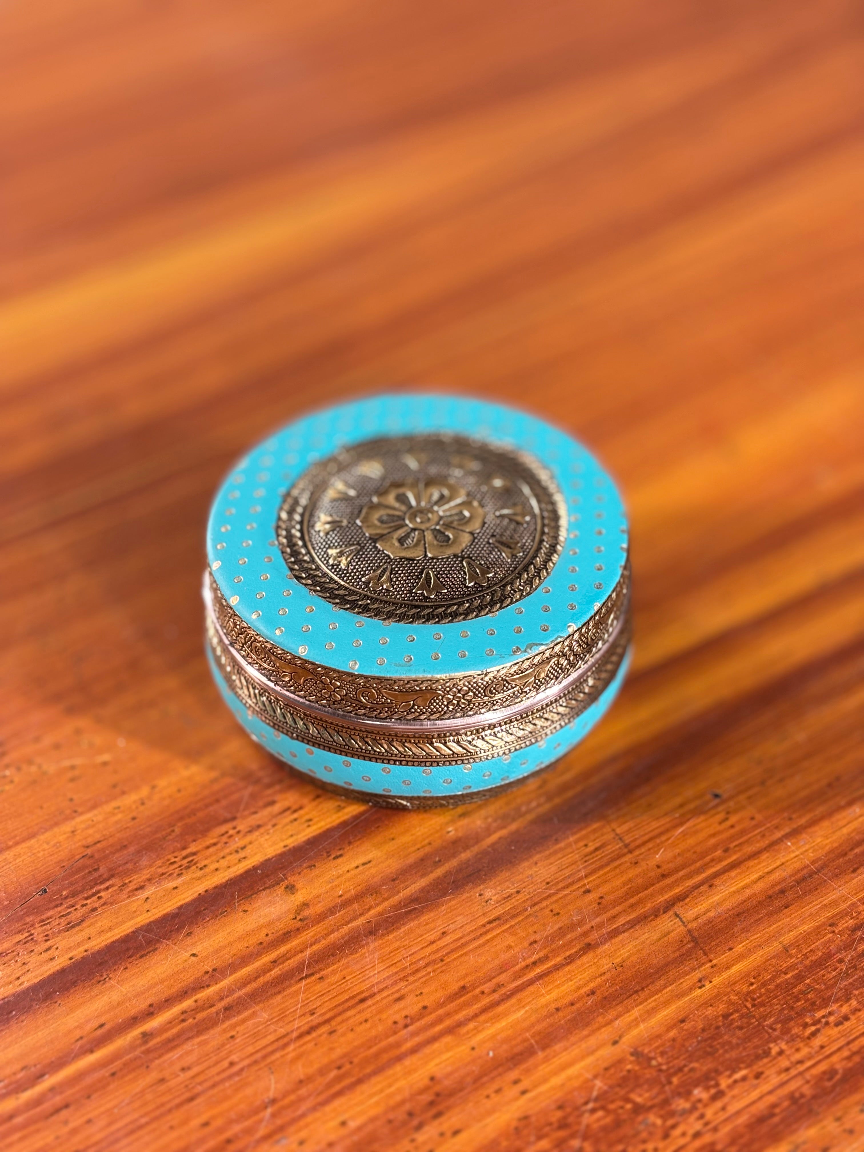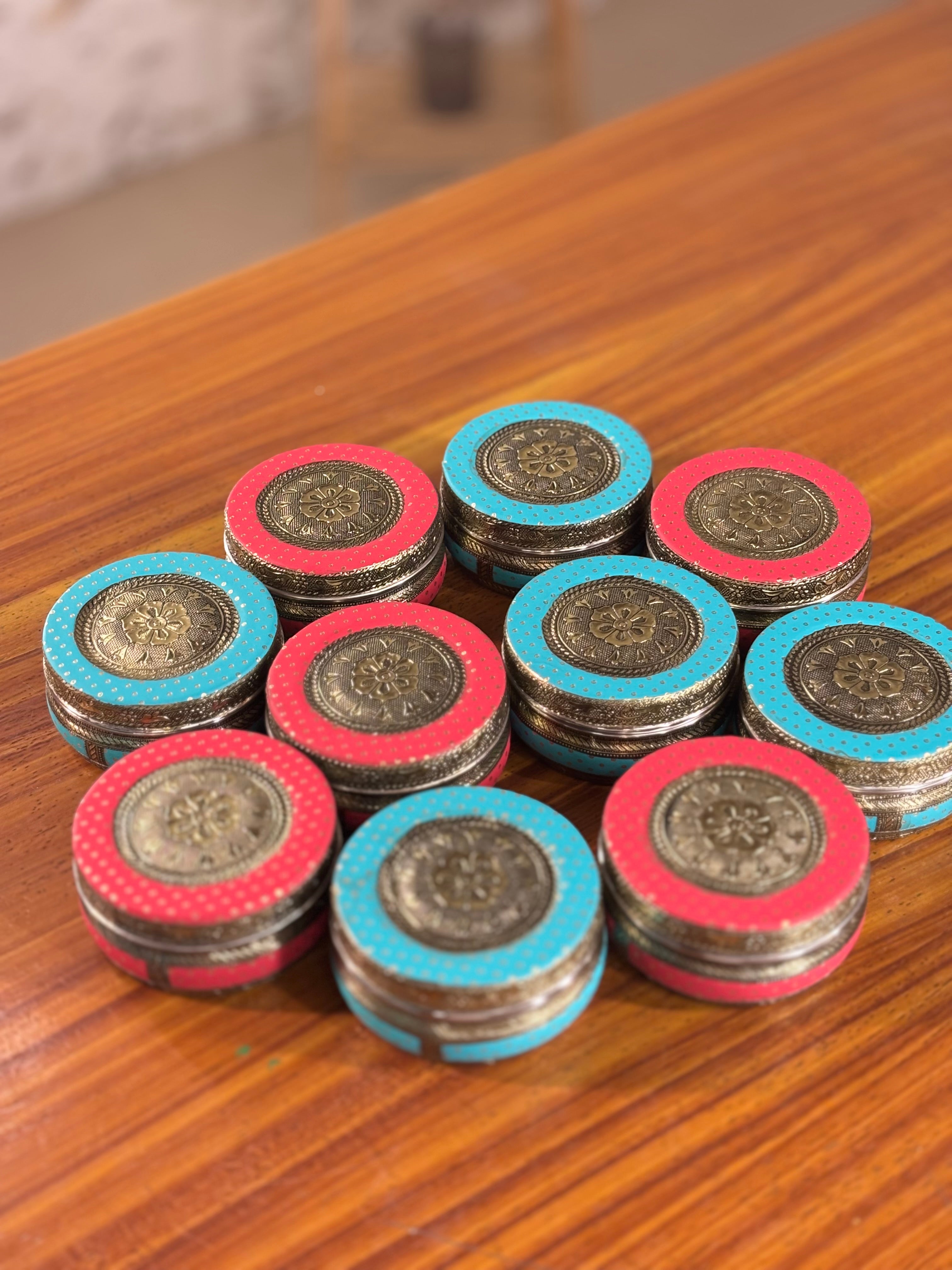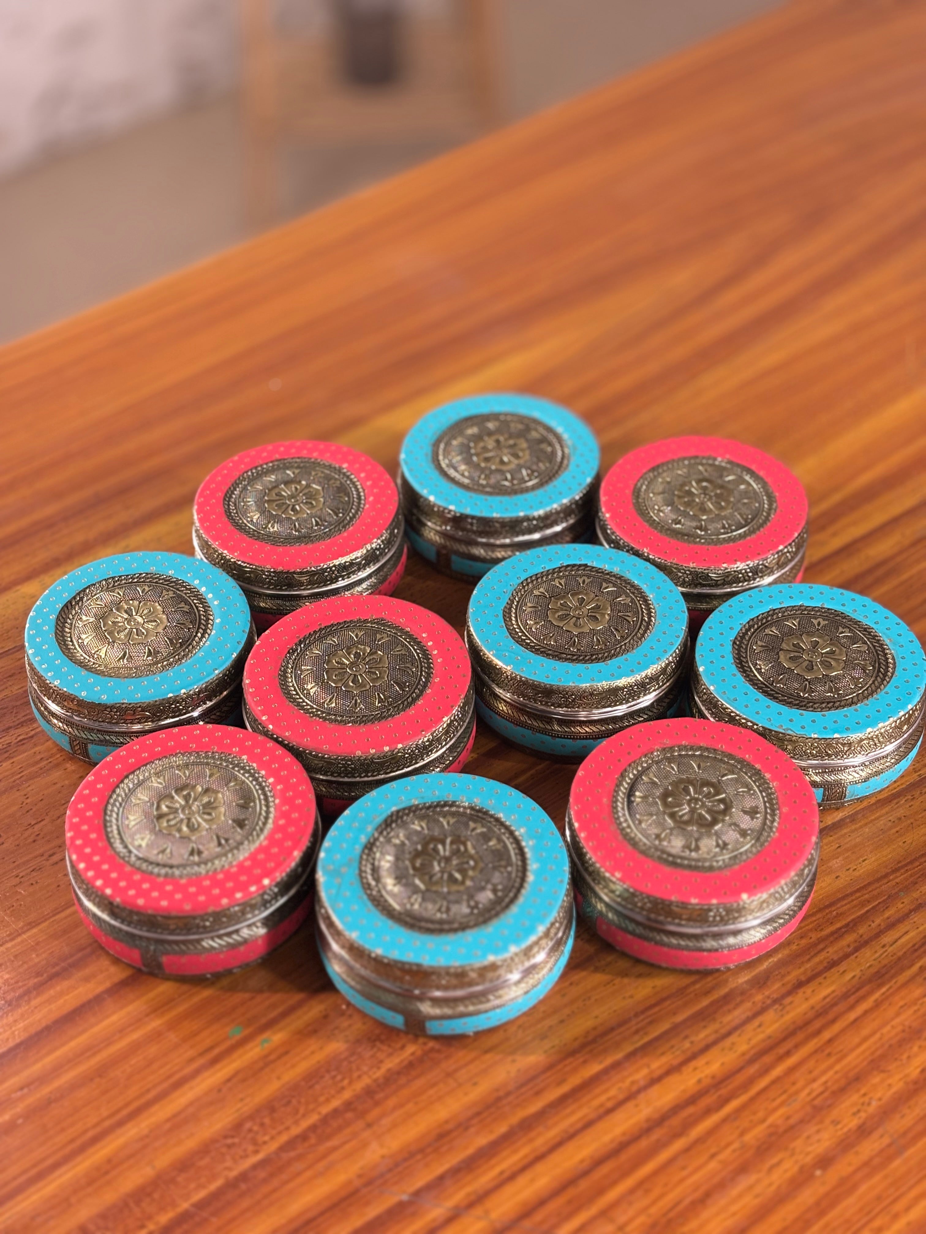 Add a touch of timeless charm to your celebrations with this Colorful Meenakari Round Box, beautifully handcrafted with intricate floral embossing and antique gold detailing. Available in vibrant pink and turquoise blue, this elegant piece is perfect for storing kumkum, chocolates, dry fruits, or tiny keepsakes.